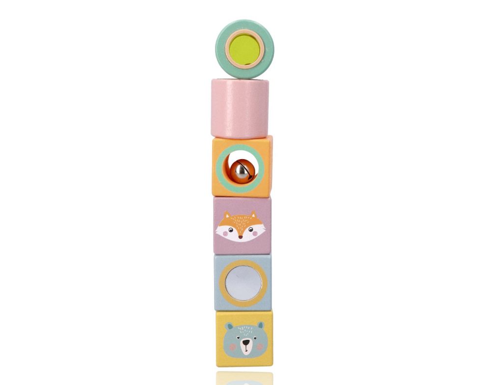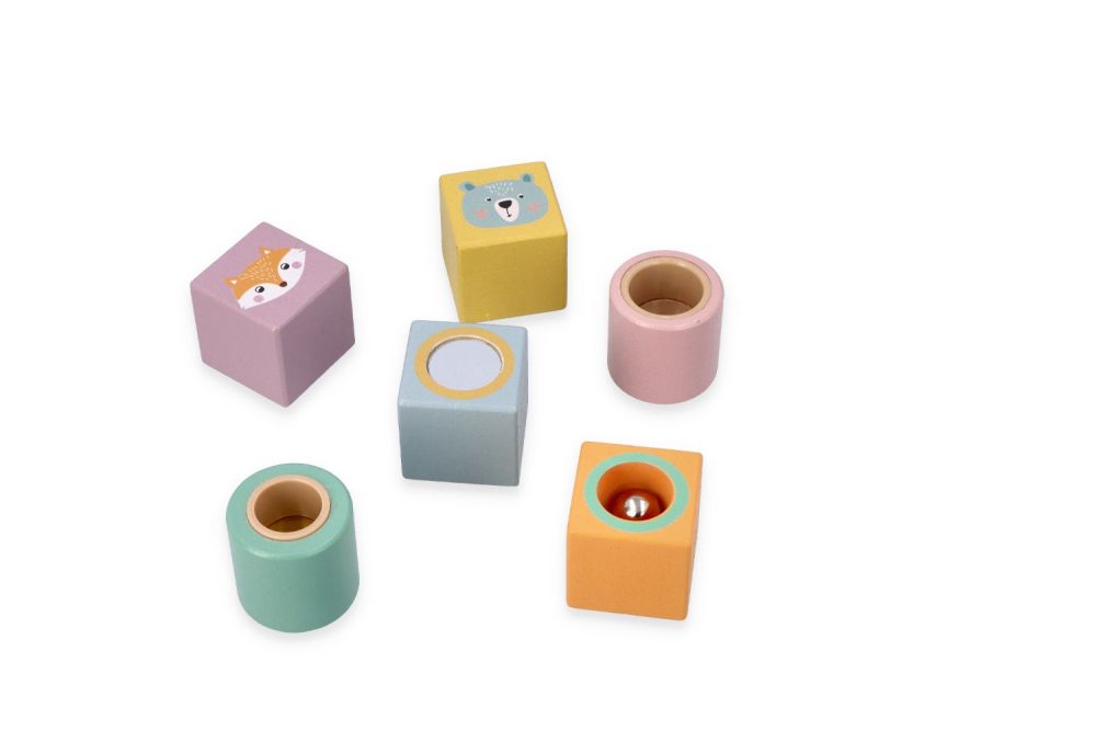 Klocki to zawsze świetny pomysł jako zabawka dla dziecka. Drewniane posłużą długo. Sensoryczne na długo zaciekawią. Piękne, delikatne kolory zachęcają do zabawy. klocki wykonane zostały z bezpiecznego, lakierowanego drewna. 4 z nich w kształcie klasycznych sześcianów, 2 o cylindrycznym kształcie. Każdy z klocków pełni osobną funkcję. Zestaw zawiera 6 elementów, ale zabawa jest nieograniczona. Idealny preznet na roczek.