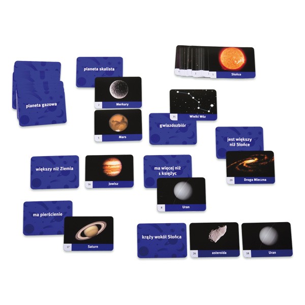 Wszechświat w tej grze, kartom z rysunkami poszczególnych elementów układu słonecznego należy przyporządkować odpowiednie karty z opisem. Kto pierwszy pozbędzie się swoich kart, wygrywa! Liczy się wiedza i liczy się szczęście.
