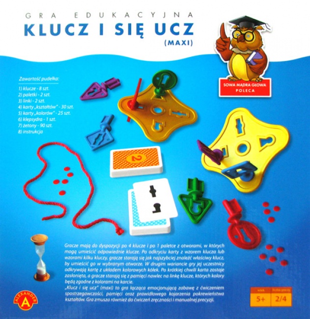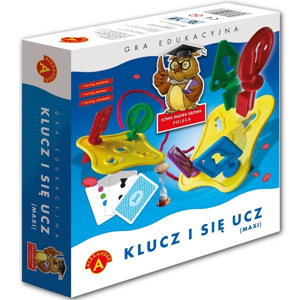 Klucz i Się Ucz MAXI to edukacyjna gra łącząca emocjonującą zabawę z ćwiczeniem spostrzegawczości, pamięci oraz prawidłowego kojarzenia pokrewieństwa kształtów. Gra jest zarazem treningiem manualnej precyzji oraz zręczności. W wersji MAXI gracze mają do dyspozycji po 4 klucze i po 1 paletce z otworami, których mogą umieścić odpowiednie klucze. Po odkryciu karty z wzorem klucza lub też wzorami kilku kluczy, gracze starają się jak najszybciej znaleźć właściwe klucze by umieścić je wybranych otworach. W drugim wariancie gry zamiast paletki korzystamy z sznurka. Podczas rozgrywki odkrywamy kartę z układem kolorowych kółek. Po krótkiej chwili zasłaniamy kartę, a gracze starają się nawlec na linkę klucze których kolor pojawił się na karcie.