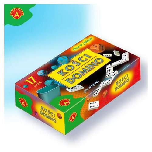 Alexander Gra Kości i Domino to dwie gry losowe w jednym opakowaniu. Każda z gier ma zupełnie inny charakter i wywołuje zupełnie inne emocje. Obie gry są w kilku wariantach. Domino to gra znana i ceniona od stuleci na całym świecie. Domino jest doskonałą grą dla całej rodziny. Kości są grą o wiekowych tradycjach. Zwycięstwo zależy od sprzyjania losu, chociaż gracz ma w pewnym stopniu wpływ na wynik rozgrywek. Gra wyzwala u wszystkich ogromne emocje. Zawartość pudełka: 6 kostek do gry, kubek, 28 kamieni, instrukcja.