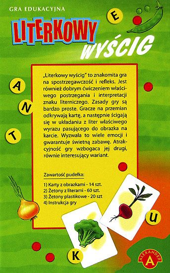 Jest dobrym ćwiczeniem właściwego postrzegania i interpretacji znaku literniczego. Zasady gry są bardzo proste. Gracze na przemian odkrywają kartę, a następnie ścigają się w układaniu z liter, właściwego wyrazu pasującego do obrazka na karcie.