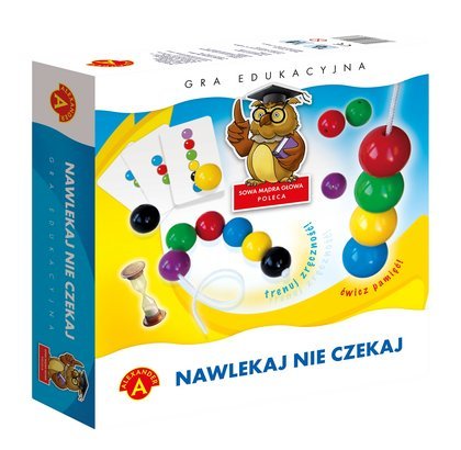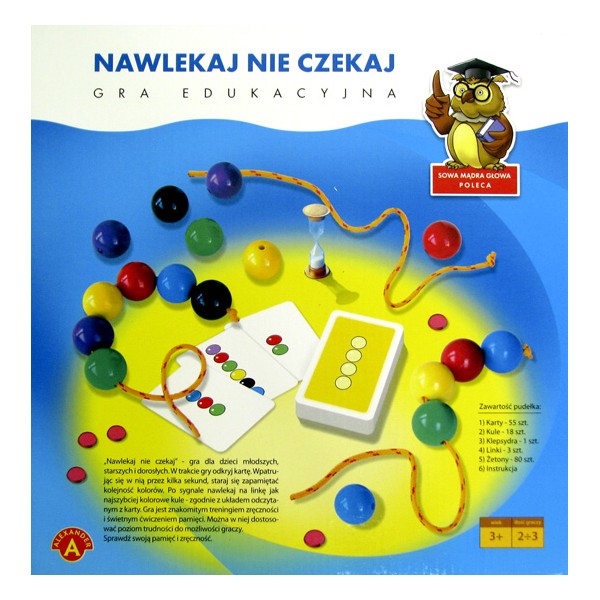 Nawlekaj Nie Czekaj to gra dla dzieci młodszych, starszych i dorosłych. W trakcie gry odkryj kartę. Wpatrując się w nią przez kilka sekund, staraj się zapamiętać kolejność kolorów. Po sygnale nawlekaj na linkę jak najszybciej kolorowe kule – zgodnie z układem odczytanym z karty. Gra jest znakomitym treningiem zręczności i świetnym ćwiczeniem pamięci. Można w niej dostosować poziom trudności do możliwości graczy. Sprawdź swoją pamięć i zręczność.