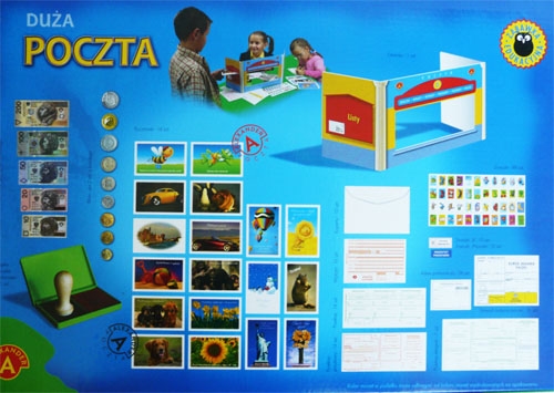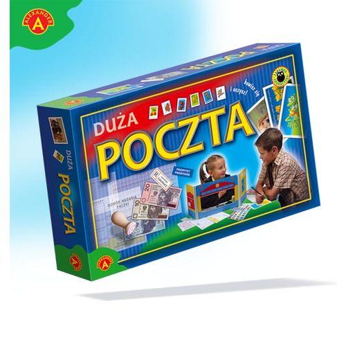 Alexander Gra Poczta Duża to znakomita zabawka edukacyjna. Składa się na nie wiele atrakcyjnych rekwizytów związanych z pracą na poczcie. Bawiąc się w pocztę dzieci poznają zasady adresowania listów i pocztówek. Dowiedzą się jak wypełnić druk na przekaz bankowy lub wpłatę gotówkową, czy też adres pomocniczy na list polecony. Te i inne czynności sprawią, że dzieci poznają na czym polegają usługi świadczone przez pocztę.