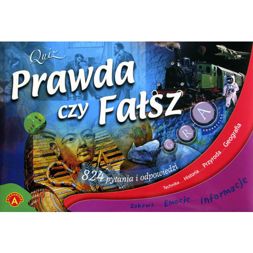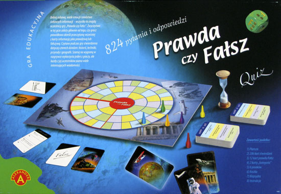 Alexander Gra Prawda czy Fałsz to zabawa gwarantująca wiele emocji i mnóstwo ciekawych informacji! Zwycięstwo w tej grze zależy głównie od tego, czy gracz prawidłowo określi przeczytaną wcześniej z karty informację jako prawdziwą lub fałszywą. Czytane podczas gry stwierdzenia dotyczą czterech dziedzin: historii, techniki, przyrody i geografii. Szansę na wygraną w grze Prawda czy Fałsz wykorzysta jeden z graczy, ale każdy z jej uczestników pozna wiele interesujących wiadomości.