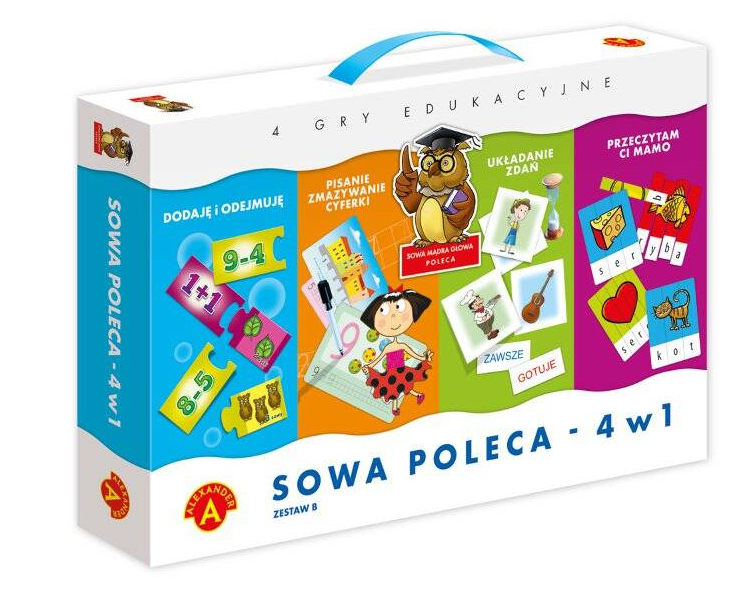 Sowa mądra głowa poleca zestaw czterech gier w jednym pudełku. Znajdziemy w nim: "Dodaję i odejmuję", "Pisanie - zmazywanie Cyferki", "Układanie zdań", "Przeczytam Ci Mamo".