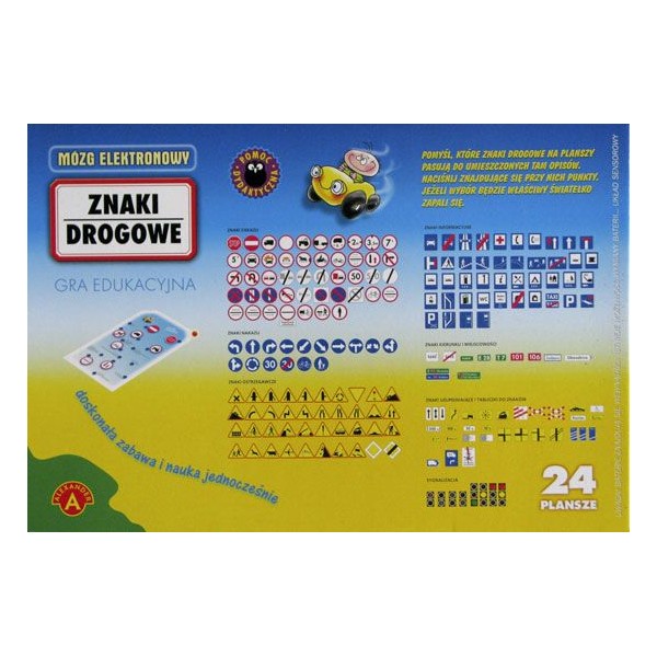 Znaki Drogowe Mózg Elektronowy to znakomita zabawka edukacyjna. Pudełko zawiera 24 plansze z wszystkimi znakami drogowymi i opisem ich znaczenia. Zabawa polega na dotknięciu palcem znaku oraz odpowiadającego mu opisu. Jeżeli wybór będzie właściwy zapali się czerwona dioda. Zabawa daje wiele satysfakcji i sprawia, że poznanie znaczenia znaków drogowych może być przyjemnością. Zadaniem przykuwającej uwagę dziecka gry jest poprawa bezpieczeństwa naszych dzieci na drogach poprzez naukę znaków i obowiązujących przepisów drogowych. Nauka odbywa się w atrakcyjnej formie zabawki elektronicznej.