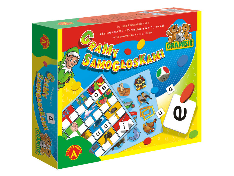 Gra składa się z 2 zabaw i 5 gier, które odnosząsię do słuchowego wyodrębnienia samogłosek na początku i na końcu wyrazu. Dzięki nim możemy wyćwiczyć z dzieckiem umiejętność łączenia dźwięku samogłoski z jej literowym (graficznym) odpowiednikiem. Zestaw przeznaczony jest do wspólnej zabawy rodziców z dziećmi, którzy chcą kształtować umiejętności malucha, zanim pójdzie do szkoły. Jest to także bardzo wartościowa pomoc dla nauczycieli przedszkoli, klas początkowych, logopedów, terapeutów.