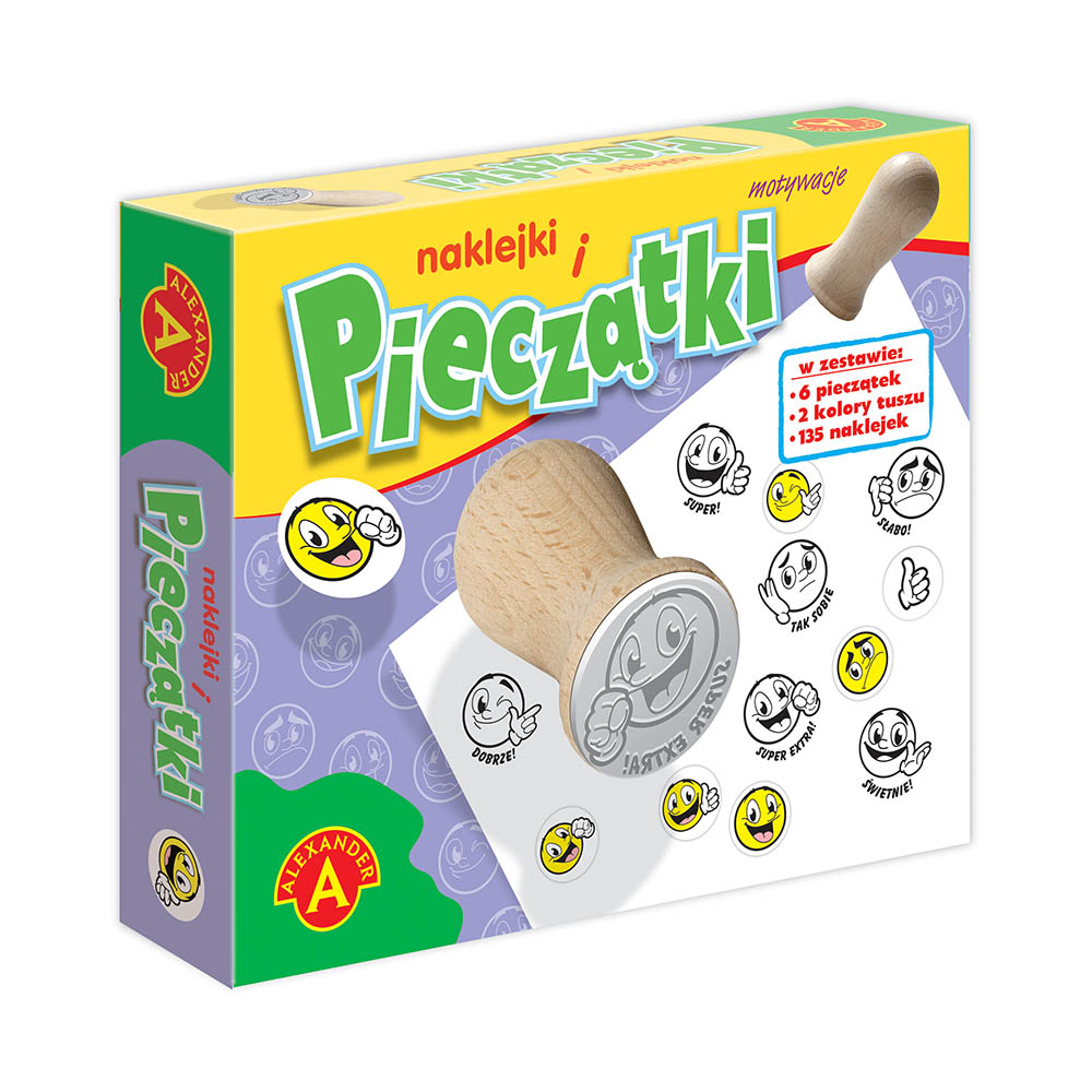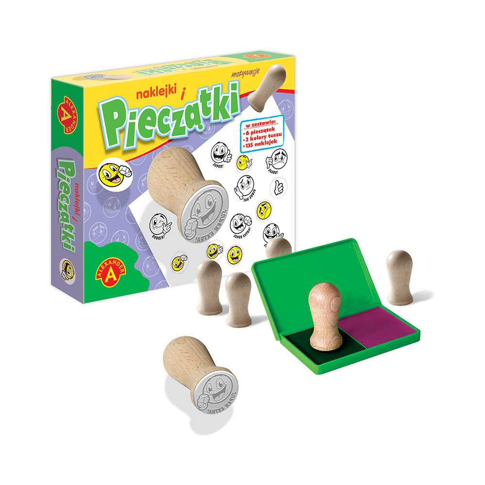 Zestaw kreatywny dla dzieci składający się z 6 pieczątek z wzorami buziek wyrażającymi poprzez mimikę i napisy uznanie lub dezaprobatę. Pieczątki można odbijać na kartce czarnym i czerwonym tuszem z poduszek znajdujących się w specjalnym, plastikowym pudełku. Odbite kształty można kolorować kredkami lub dodatkowo ozdabiać nimi swoje rysunki. 135 kolorowych naklejek urozmaica zabawę. Wszystkie elementy znajdują się w eleganckiej, funkcjonalnej wyprasce. Doskonała pomoc wychowawcza dla pedagogów i rodziców. 100% polski produkt wytwarzany w całości w fabryce Alexandra.