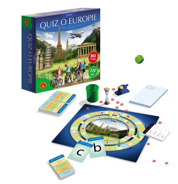 "Quiz o Europie - wielki" to fascynująca gra i świetna zabawa, w trakcie której uczestnicy odpowiadają na pytania o Europie. Gracze mogą odpowiadać na 804 pytania z 201 kart, a do wyboru mają 2412 odpowiedzi. Tematami pytań i odpowiedzi są: historia, geografia i przyroda, nauka i technika oraz kultura i sztuka Europy. W czasie gry można wykazywać się również swoją zręcznością, strzelając z katapulty do celu.
