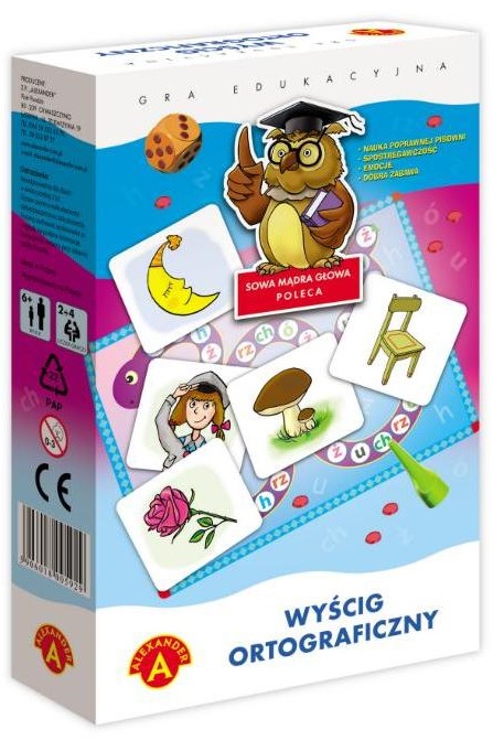 W grze "Wyścig ortograficzny" wygrywa ten, kto najszybciej odnajdzie, wśród tabliczek leżących na stole, obrazek zawierający w nazwie literę z pola, na którym zatrzymał się pionek. W trakcie zabawy dzieci poznają i utrwalają sobie właściwą pisownię wyrazów z "rz", " ż", "ch", "h", "ó" i "u". Gra jest również świetnym treningiem spostrzegawczości i refleksu dla młodszych i starszych graczy.