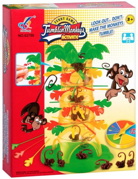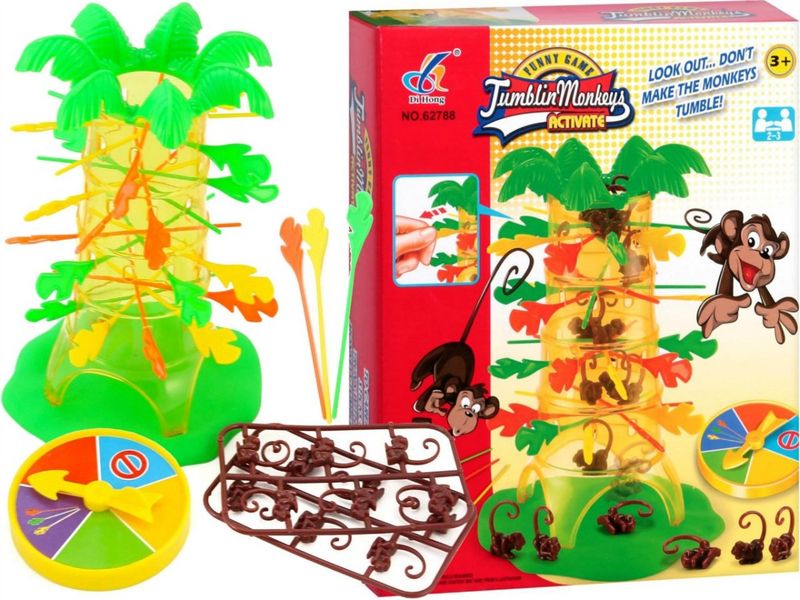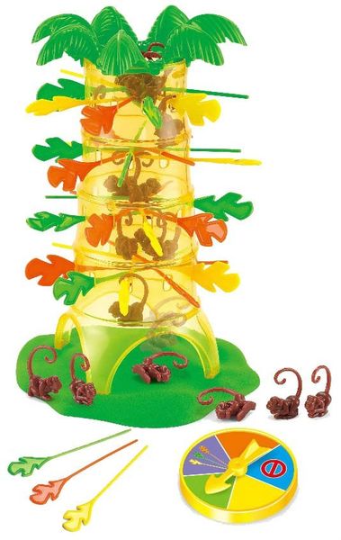 Wspaniała gra ćwicząca zręczność oraz koncentrację dzieci. Gracze wkładają różnokolorowe patyczki w pień palmy, a następnie wrzucają do środka palmy małpki, które zahaczają o patyczki ogonami. Gracz losuje zegarem z kolorowymi polami, a następnie wyciąga z palmy wylosowany kolor patyczka. Cała sztuka polega na tym, aby przy tym nie spadła żadna małpka! Spadające małpki to gwarancja miło spędzonego czasu dla całej rodziny.