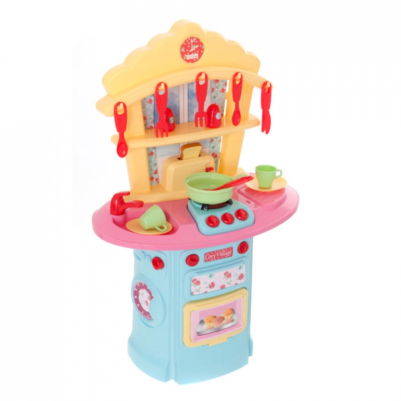 Zestaw Elektroniczna Kuchnia składa się z modelu kuchni z palnikiem, która wydaje dźwięk. Na blacie kuchni znajduje się zlewozmywak, miejsce na naczynia, w modelu jest też piekarnik, a z boku bęben pralki oraz półeczka na akcesoria.