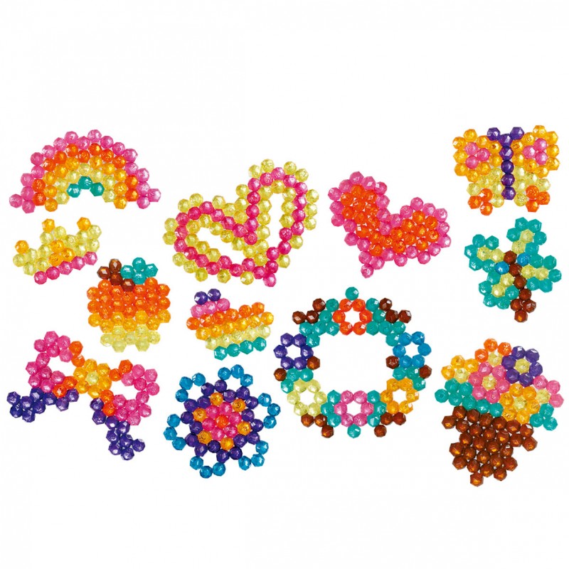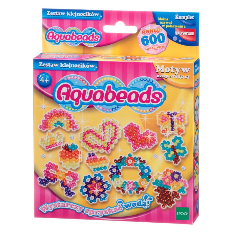 Dzięki temu zabawnemu zestawowi Aquabeads, możesz tworzyć własne ozdoby i prezenty dla najbliższych. Użyj ponad 600 koralików w 8 kolorach, aby tworzyć błyszczące projekty z Aquabeads. Już teraz możesz stworzyć derce, motylka, kokardki, a nawet smakowicie wyglądające lody. Wybierz odpowiedni szablon, połóż na nim tackę do układania i stwórz właściwy wzór! Następnie spryskaj koraliki wodą, a zobaczysz jak magicznie się do siebie przykleją tworząc jedną całość!