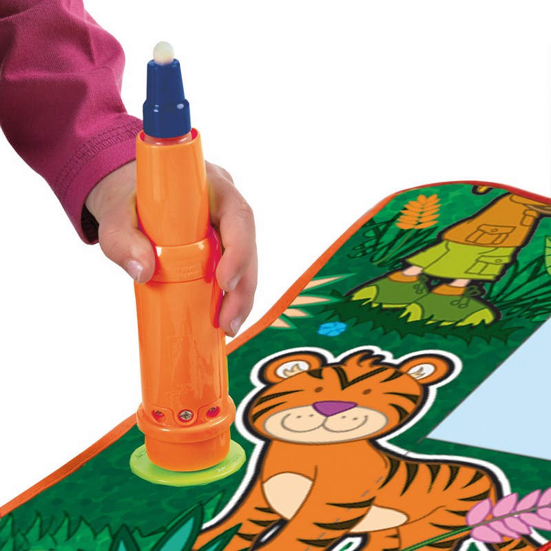 Aquadoddle jest pierwszą matą, która pozwala na tworzenie rysunków za pomocą flamastra z wodą, które po chwili w magiczny sposób znikają. Specjalny flamaster należy wypełnić czystą wodą nie potrzeba żadnych tuszów, farb ani innych koloryzujących substancji. Twoje dziecko może również tworzyć magiczne rysunki odbijając wilgotne dłonie na macie.