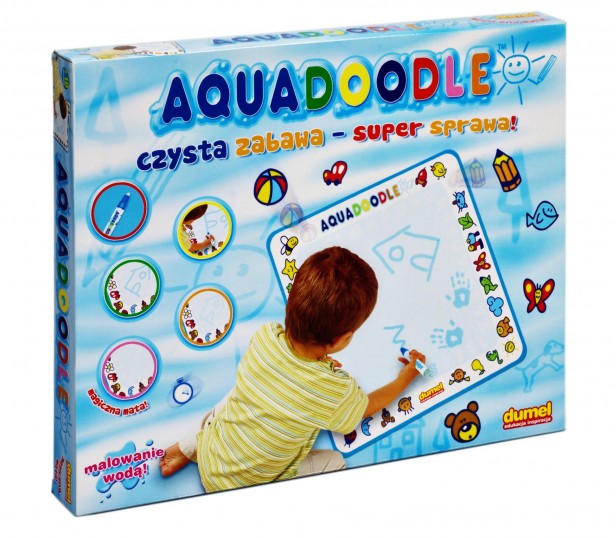 Aquadoddle jest pierwszą matą, która pozwala na tworzenie rysunków za pomocą flamastra z wodą, które po chwili w magiczny sposób znikają. Specjalny flamaster należy wypełnić czystą wodą, nie potrzeba żadnych tuszów, farb ani innych koloryzujących substancji. Twoje dziecko może również tworzyć magiczne rysunki odbijając wilgotne dłonie na macie. Mata Aquadoodle wspomaga rozwój koncentracji, koordynacji ruchowej, precyzji oraz kreatywność, a dodatkowo daje dzieciom mnóstwo wspaniałej zabawy.