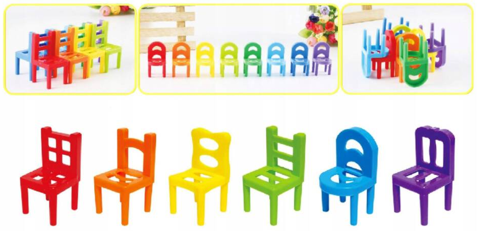 W zestawie znajduje się 40 krzesełek w 6 wzorach i w 8 kolorach. Taka różnorodność pozwala rozszerzać warianty gry. Zabawka rozwija postrzeganie przestrzenne oraz motorykę ręki. Uczy cierpliwości, a także logicznego i strategicznego myślenia.