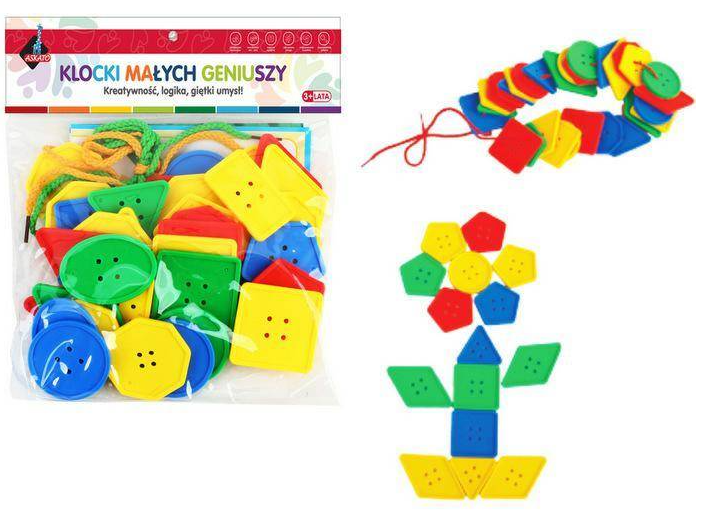 Kolorowe klocki do nawlekania w kształcie guzików pobudzą wyobraźnię każdego dziecka. Zabawka wspomaga rozwój manualny i sensoryczny. W zestawie klocki w 4 kolorach: niebieski, zielony, czerwony, żółty oraz sznureczki na które nawleka się guziczki.