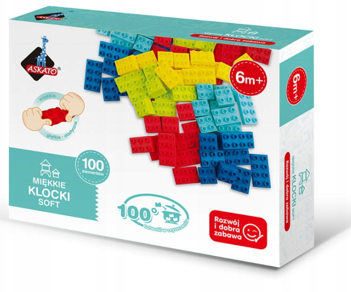 Miękkie klocki to idealna propozycja dla maluszków już od 6 miesiąca życia. W zestawie znajduje się 100 kolorowych, elastycznych klocków. Klocki są rozciągliwe, lekkie i dostosowane do małych rączek dziecka. Maluszek może brać je do buzi, bawić się nimi w wannie czy na dywanie w pokoju.