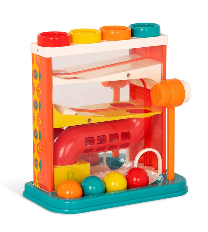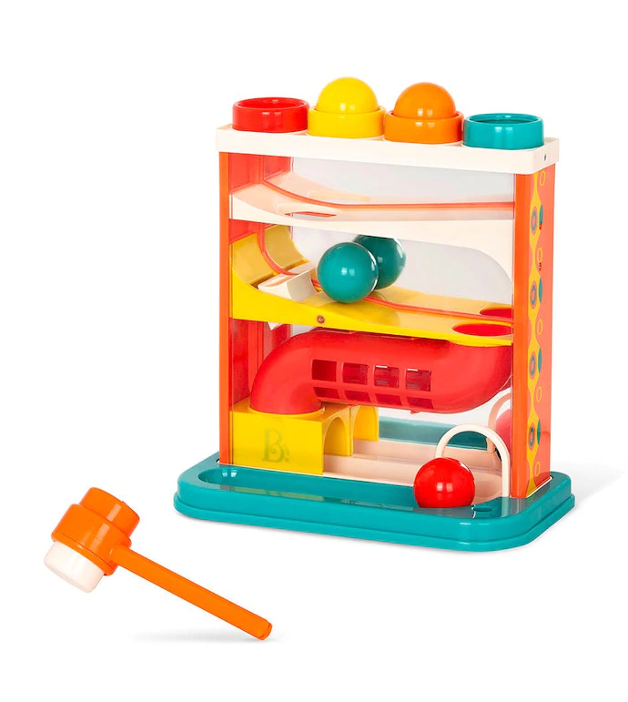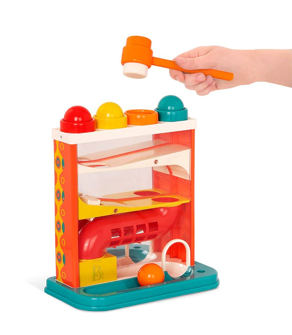 Ustaw kulki na górze toru, wbij je młotkiem i obserwuj z radością, jak kulki toczą się po torze z góry do dołu! Gdy kulki stoczą się na dół, możesz rozpocząć zabawę od nowa! Lustrzane tło stanowi dodatkową atrakcję, przyciągającą uwagę dziecka. Młotek wydaje zabawne dźwięki podczas uderzania w kulki. Zabawka uczy logicznego myślenia oraz znakomicie obrazuje zależność przyczynowo-skutkową. Produkt polecany jest również do celów terapeutycznych.