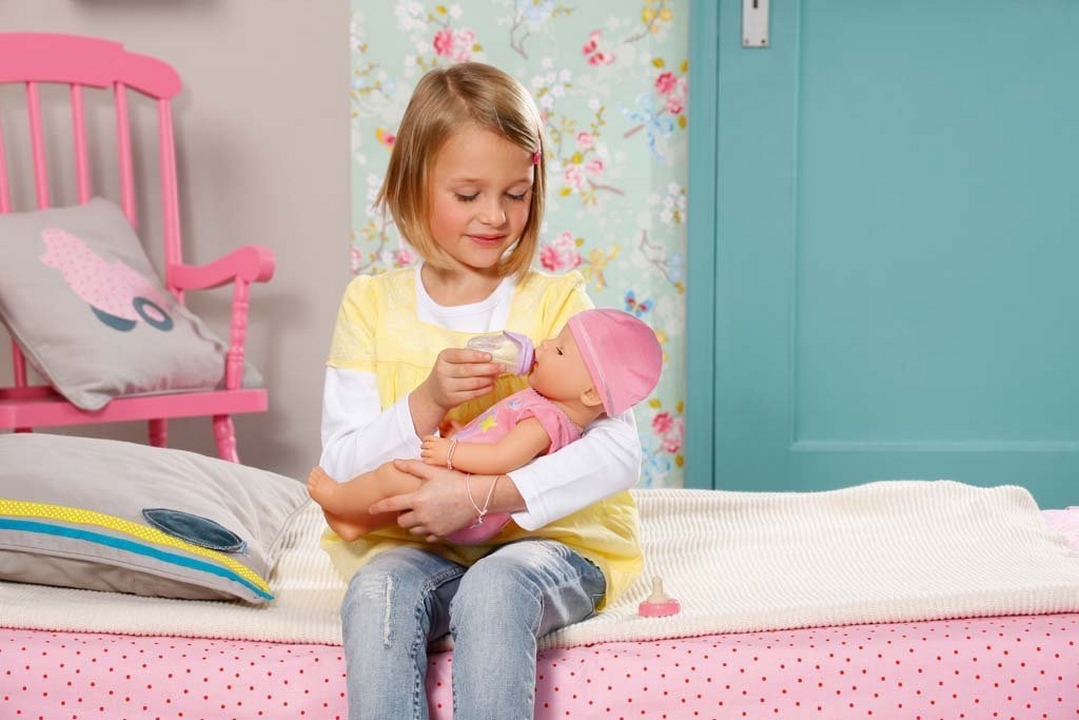Interaktywna lalka baby born pomoże wcielić się małym dziewczynkom w rolę mamy. Wraz z lalki otrzymujemy mnóstwo akcesoriów, wśród których znajdziemy łyżeczkę, smoczek czy buteleczkę do karmienia. Dziewczynkom z pewnością spodoba się także bransoletka z serduszkiem dla siebie i laleczki. W nowym model poprawiono funkcję karmienia i uproszczono załatwianie potrzeb. Lalka została także wykonana z przyjemniejszego i bardziej miękkiego materiału.