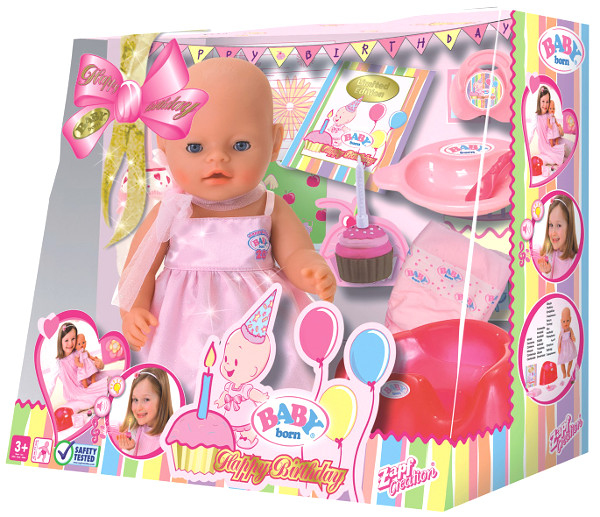 Baby born w urodzinowej, satynowej sukience z mnóstwem ślicznych akcesoriów na urodziny powstała z okazji 20 rocznicy marki. Lalka ma aż 9 funkcji nie wymagających baterii odwzorowujących naturalne odruchy niemowląt: pije z butelki, je swoje specjalne jedzonko, moczy pieluszki, korzysta z nocniczka, 'piszczy' z radości i płacze prawdziwymi łzami i wiele innych. Dodatkowo do laleczki dziewczynki dostają torcik ze świecącą świeczką i urodzinową melodią.