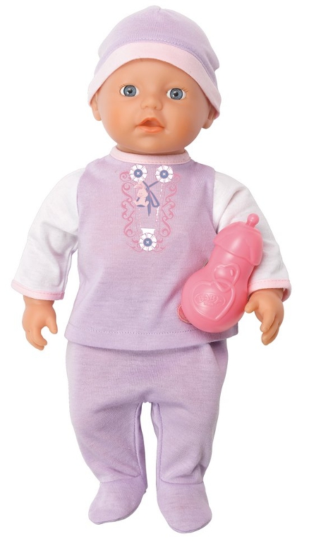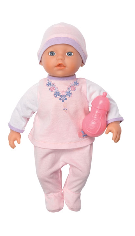Urocza laleczka Baby Born wykonana jest z miłego w dotyku i miękkiego materiału. Dzidziusia można kąpać, a w zestawie oprócz lali znajdziesz buteleczkę do karmienia. Lalka ubrana jest w różowy komplecik z pastelowymi aplikacjami i czapeczkę.