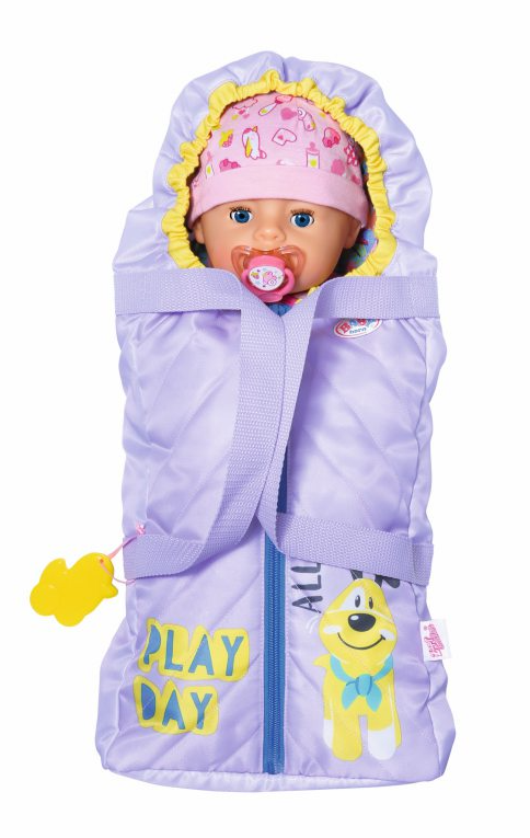 To śliczne nosidełko pełni podwójną rolę. Jeśli nie chcesz korzystać z wózka możesz zabrać Baby Born gdzie tylko chcesz. Po udanej wyprawie czas ułożyć swą ukochaną laleczkę do snu. Nosidełko zamienia się wtedy w śpiworek. Zapięcie na suwak pozwala szybko i sprawnie otworzyć nosidełko, dzięki czemu BABY born można łatwo wyjąć i włożyć. Nosidełko uszyto z trwałych materiałów w kolorze fioletowym z żółtą lamówką. Nosidełko przeznaczone dla lalek 43 cm.