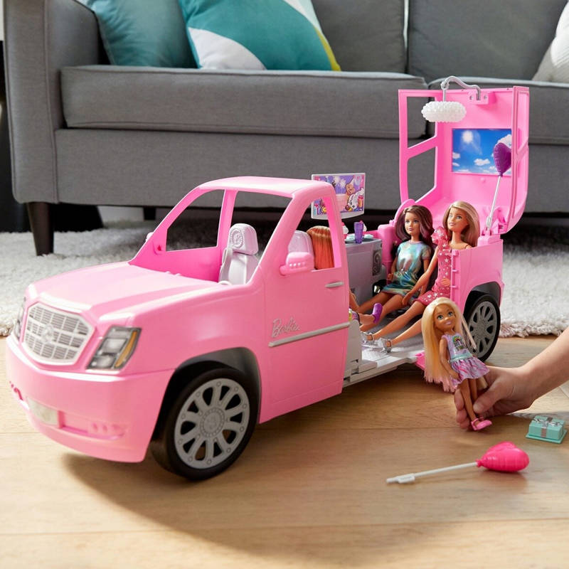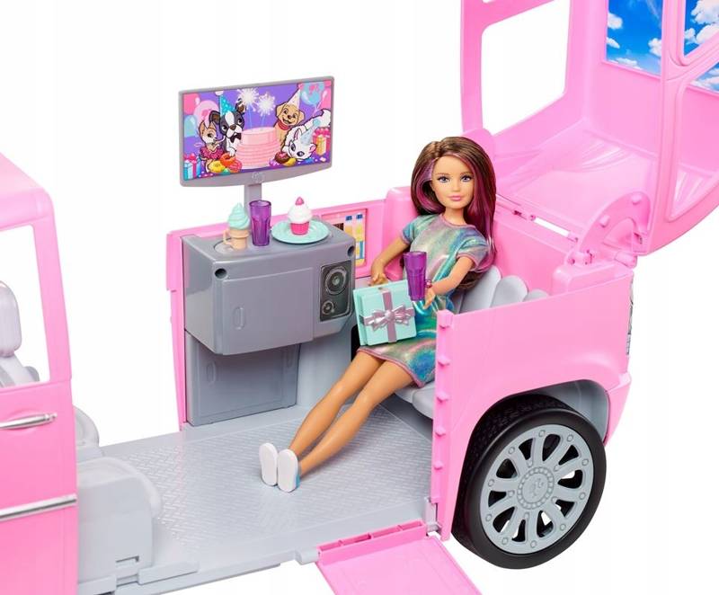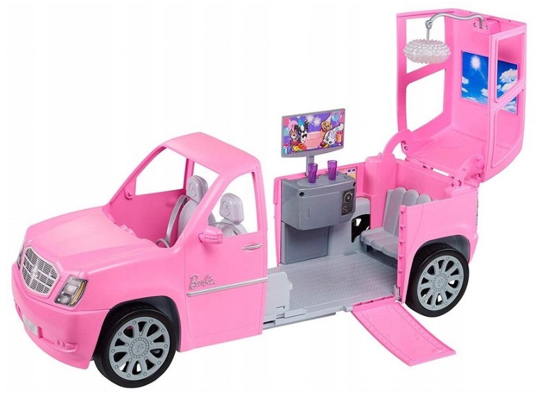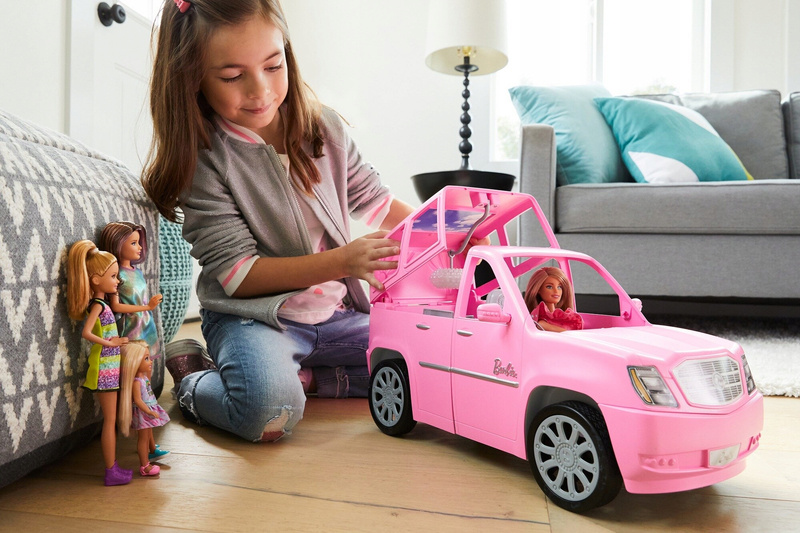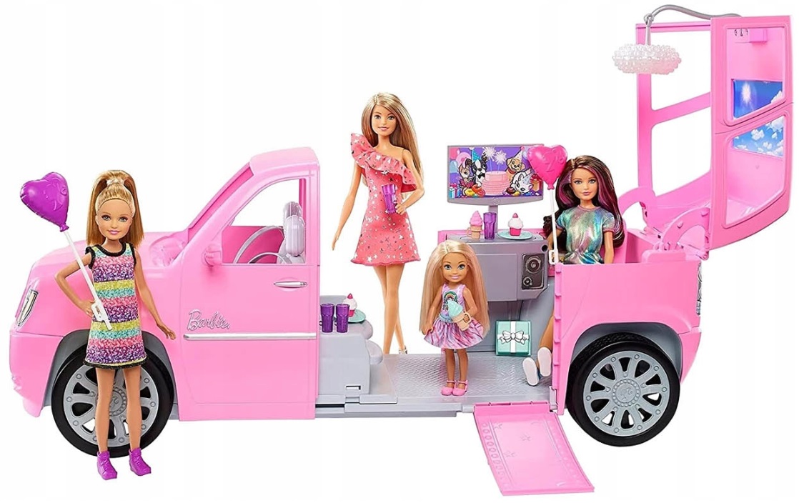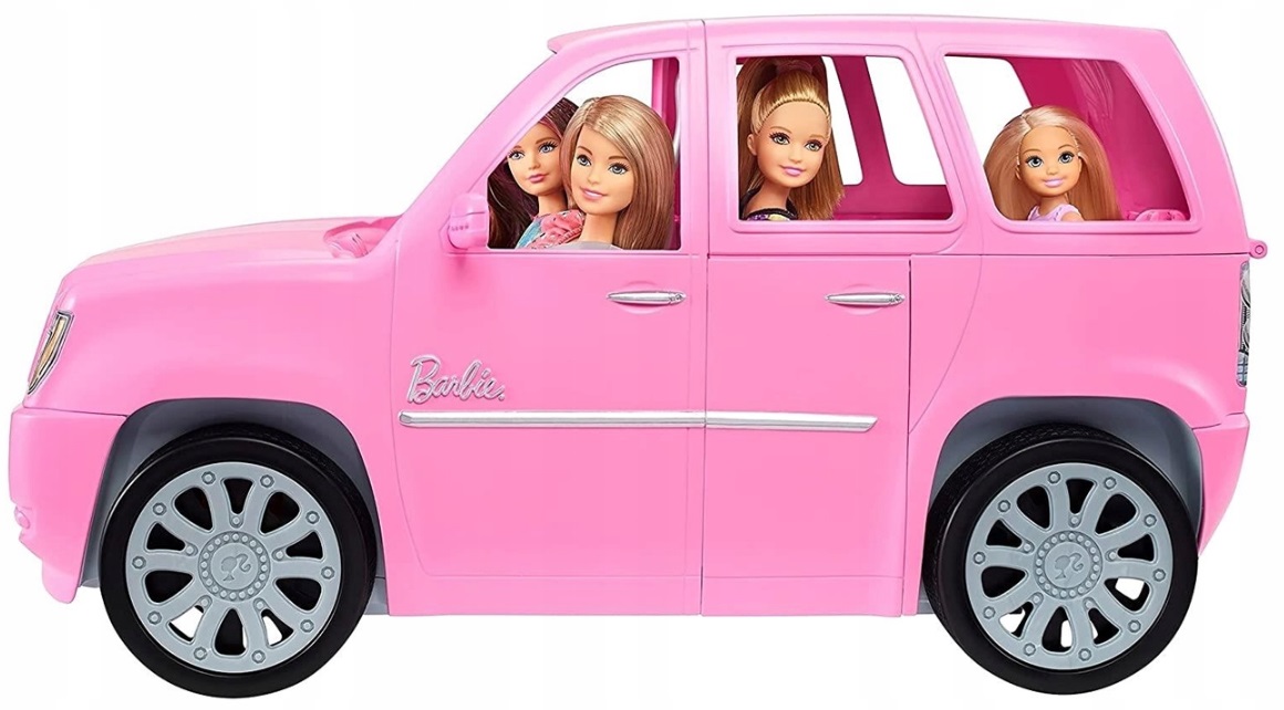 Wsiądź do różowego SUVa Barbie i rusz w trasę! Masz ochotę wybrać się na przejażdżkę? Wsiądź do wielkiego auta, które pomieści aż cztery lalki znajdujące się w zestawie - lalka Barbie, Skipper, Stacy oraz Chelsea. Każda lalka ubrana jest w wyjątkową stylizację. Pojazd w stylu SUV, który po rozłożeniu ma 60 cm długości, a wnętrze jest przygotowane na przyjęcie. Wystarczy otworzyć dach i boki, a potem pociągnąć, aby dokonać transformacji. Na przyjęciu nie może zabraknąć ozdób i smakołyków. W akcesoriach znajdziesz balony, słodkie desery, kubeczki, a także prezent.