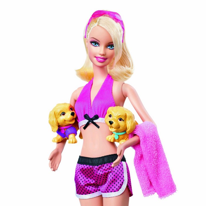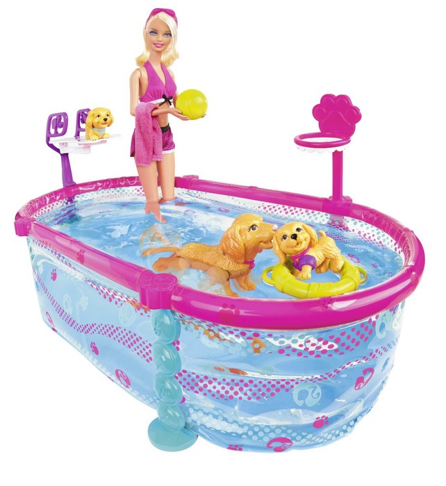 Barbie wraz ze swoim psem Taffy prowadzi szkołę pływania dla szczeniaczków. Suczka Taffy świetnie czuje się w wodzie. Dzięki nakręcanemu ogonkowi piesek pływa a magnes umieszczony w pyszczku pozwala mu popychać, uczące się pływać szczeniaczki, po wodzie. Szczeniaczki, gdy naciśniesz przycisk na skoczni, chętnie skaczą z trampoliny umieszczonej nad basenem. Po skończonej lekcji pływania Barbie możne wytrzeć mokre pieski ręcznikiem. Każda dziewczynka może urządzić konkurs skoków albo grać ze szczeniaczkami w koszykówkę.