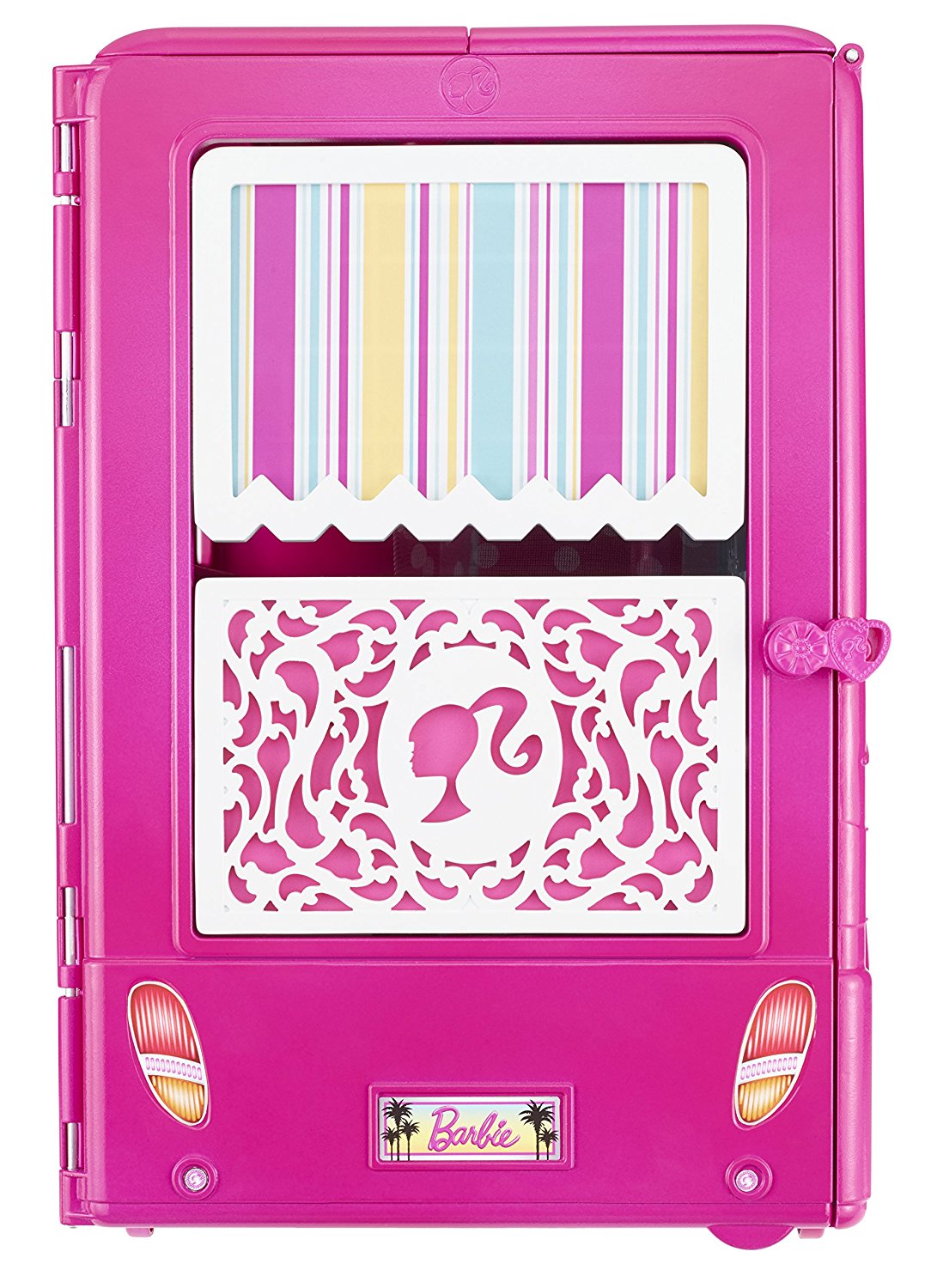 Wszystkie elementy utrzymane są w charakterystycznym, różowym kolorze. Wystarczy odczepić kabinę kierowcy, aby móc rozkoszować się orzeźwiającą wodą basenu, dodatkowo przyczepę można rozłożyć, a wtedy naszym oczom ukaże się śliczny i stylowy domek dla lalek. Wewnątrz znajduje się aneks kuchenny wyposażony w kuchenkę z piekarnikiem, szafki na jedzenie, a nawet maszynę do napojów. Ponadto przyczepa oferuje także stolik, który, po odwróceniu, służy jako grill, dwa krzesełka, cztery miejsca do spania - podwójne łóżko oraz dwa dodatkowe miejsca do spania, które można ukryć w ścianie, kiedy się ich nie używa, oraz łazienkę, gdzie znajduje się prysznic z uroczą różową zasłonką w białe grochy oraz toaleta.