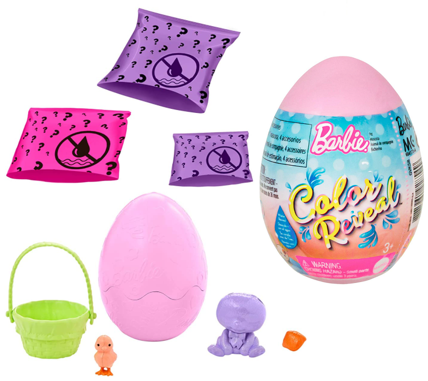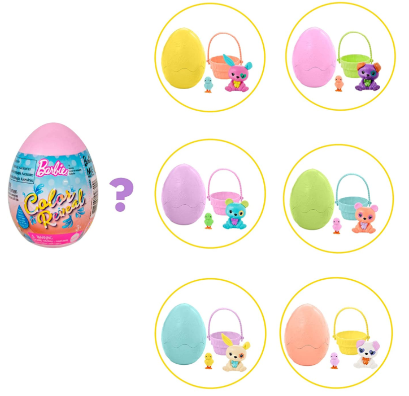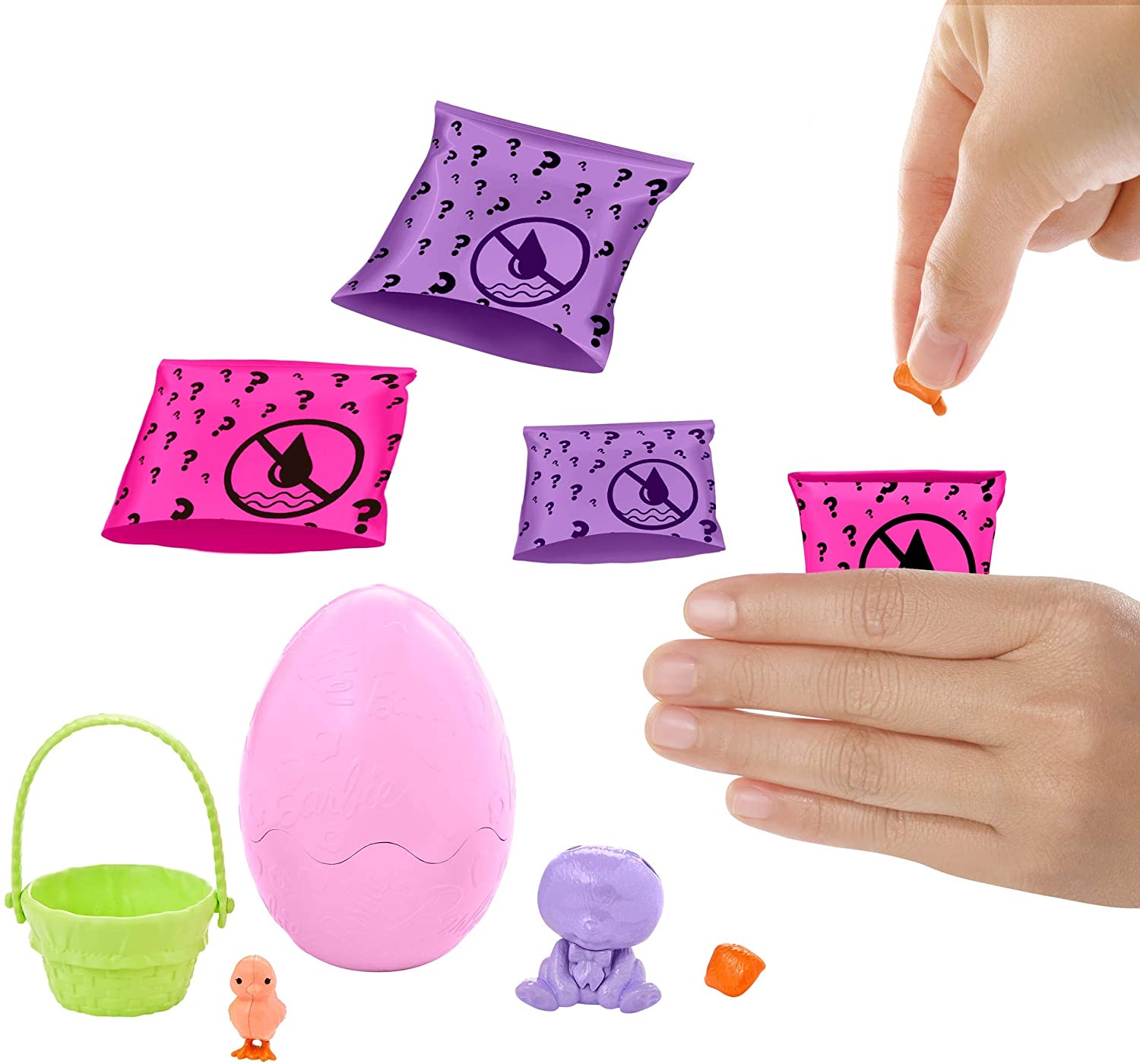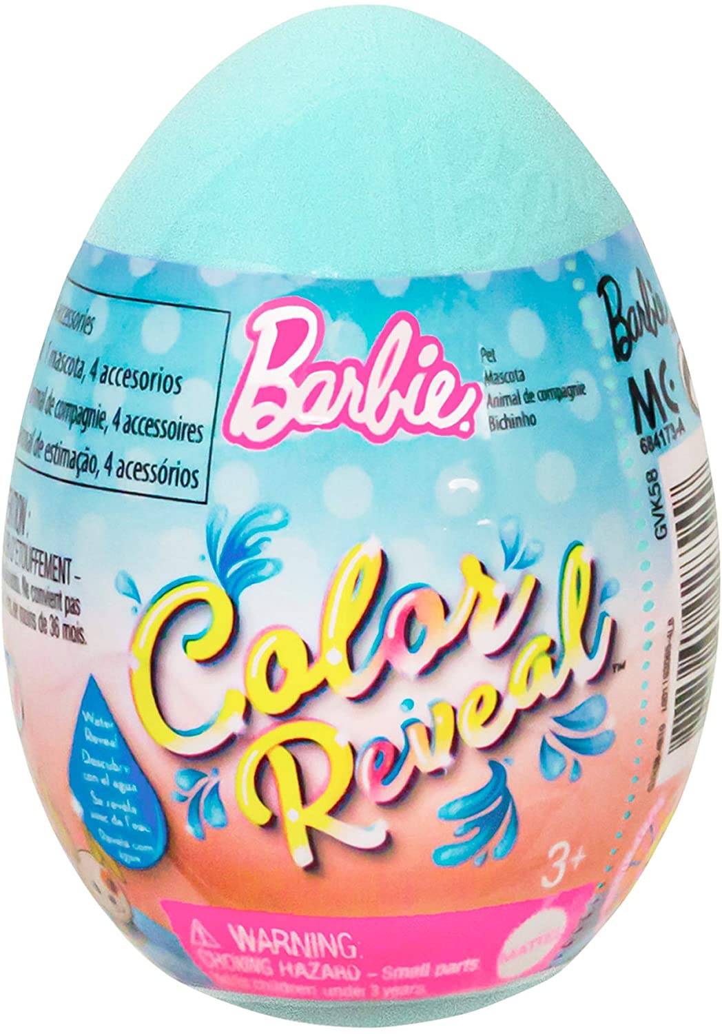 Barbie Color Reveal Jajko z niespodzianką to wspaniała zabawa w odkrywanie, czeka Cię aż pięć niespodzianek! Na początek otwórz wielkanocne jajko, w którego środku znajdziesz cztery tajemnicze torebki, a w nich metaliczną fioletową figurkę zwierzątka Color Reveal oraz trzy akcesoria! Zanurz figurkę w wodzie i nieco nią poruszaj. Woda zmieni kolor na fioletowy, a po wyciągnięciu zwierzątka odkryjesz jego wygląd! Każde zwierzątko ma ozdobną kokardkę. Otwórz pozostałe torebki, aby znaleźć kurczątko, koszyczek i zwierzęce uszka – istnieje ponad 20 kombinacji zwierzątek i uszek! Użyj zimnej wody, aby odkryć ozdobę na pyszczku zwierzątka. Którego zwierzaka znajdziesz?