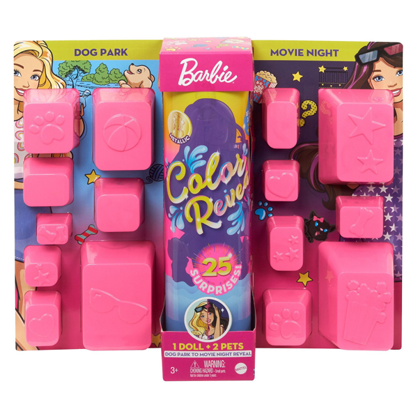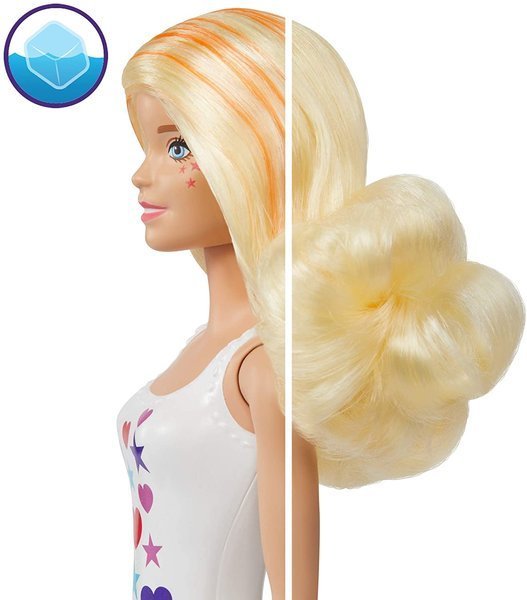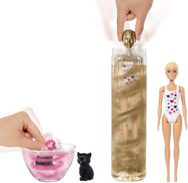 Barbie kolorowa niespodzianka to lalka, która wraz z akcesorami zamknięta jest w tubie. Z dużym zaciekawieniem dziewczynki będą otwierać tubę, gdyż nie wiedzą, którą lalkę mają w zestawie. Otwieramy tubę, w której ukazje nam się złota lalka surprise, a w saszetkach są ukryte dodatki. Lalka ukazuje się dopiero po zanurzeniu jej w ciepłej wodzie. Wtedy złota warstwa zaczyna musować, a nam ukazuje się lalka, którą udało nam się otrzymać. Dodatkowo z lalka w zestawie znajduje się zwierzątko.