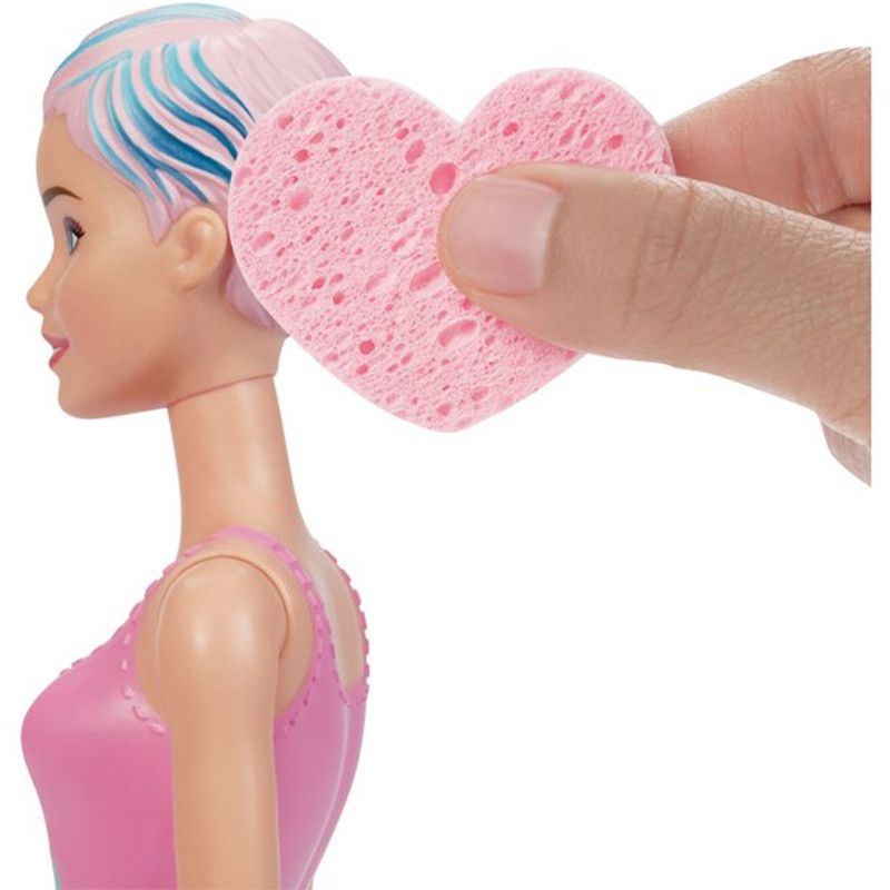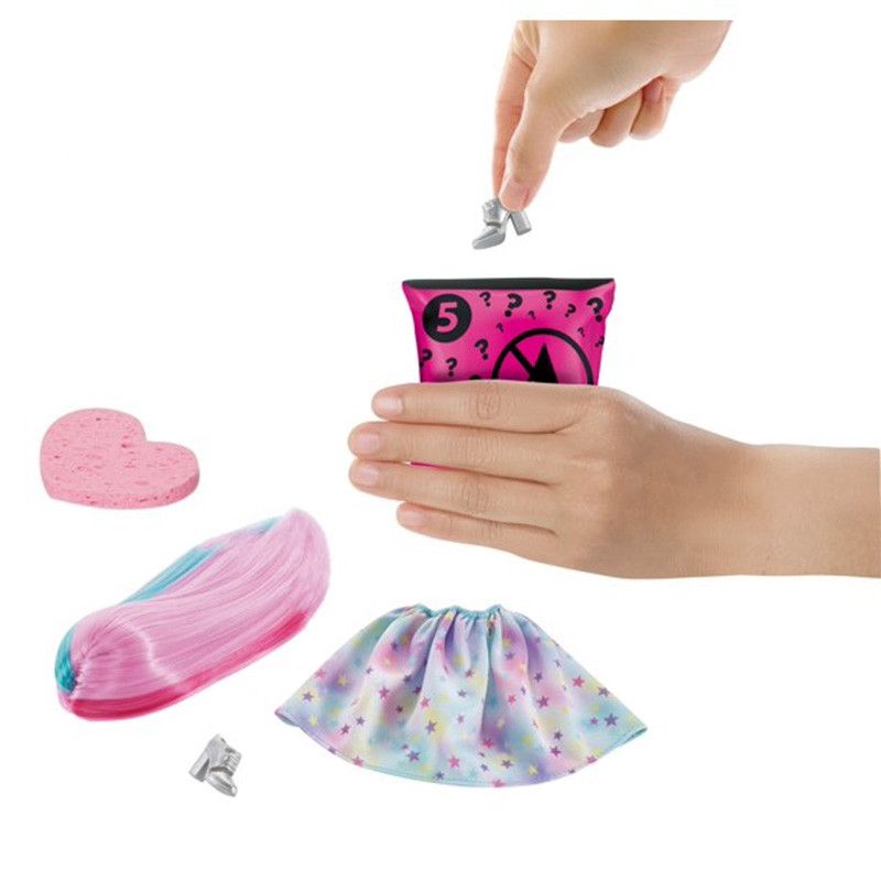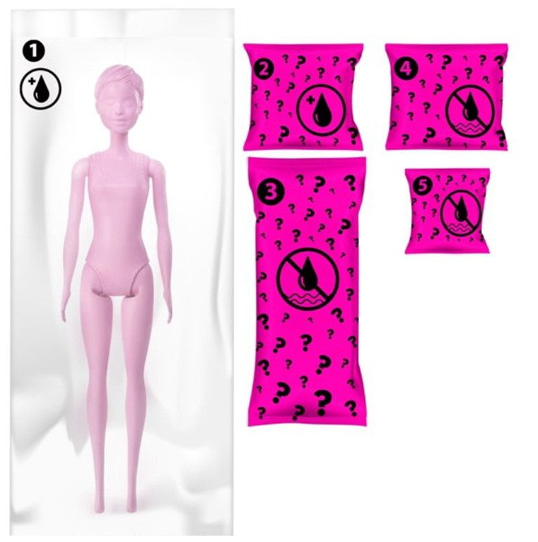 Barbie kolorowa niespodzianka to lalka, która wraz z akcesorami zamknięta jest w tubie. Z dużym zaciekawieniem dziewczynki będą otwierać tubę, gdyż nie wiedzą, którą z 5 lalek mają w zestawie. Otwieramy tubę pociągając za pasek i w przezroczystej tubie ukazje nam się różowa lalka surprise, a w czterech saszetkach ukryte dodatki. Lalka ukazuje się dopiero po zanurzeniu jej w ciepłej wodzie. Wtedy różowa warstwa zaczyna musować, a nam ukazuje się lalka, którą udało nam się otrzymać.