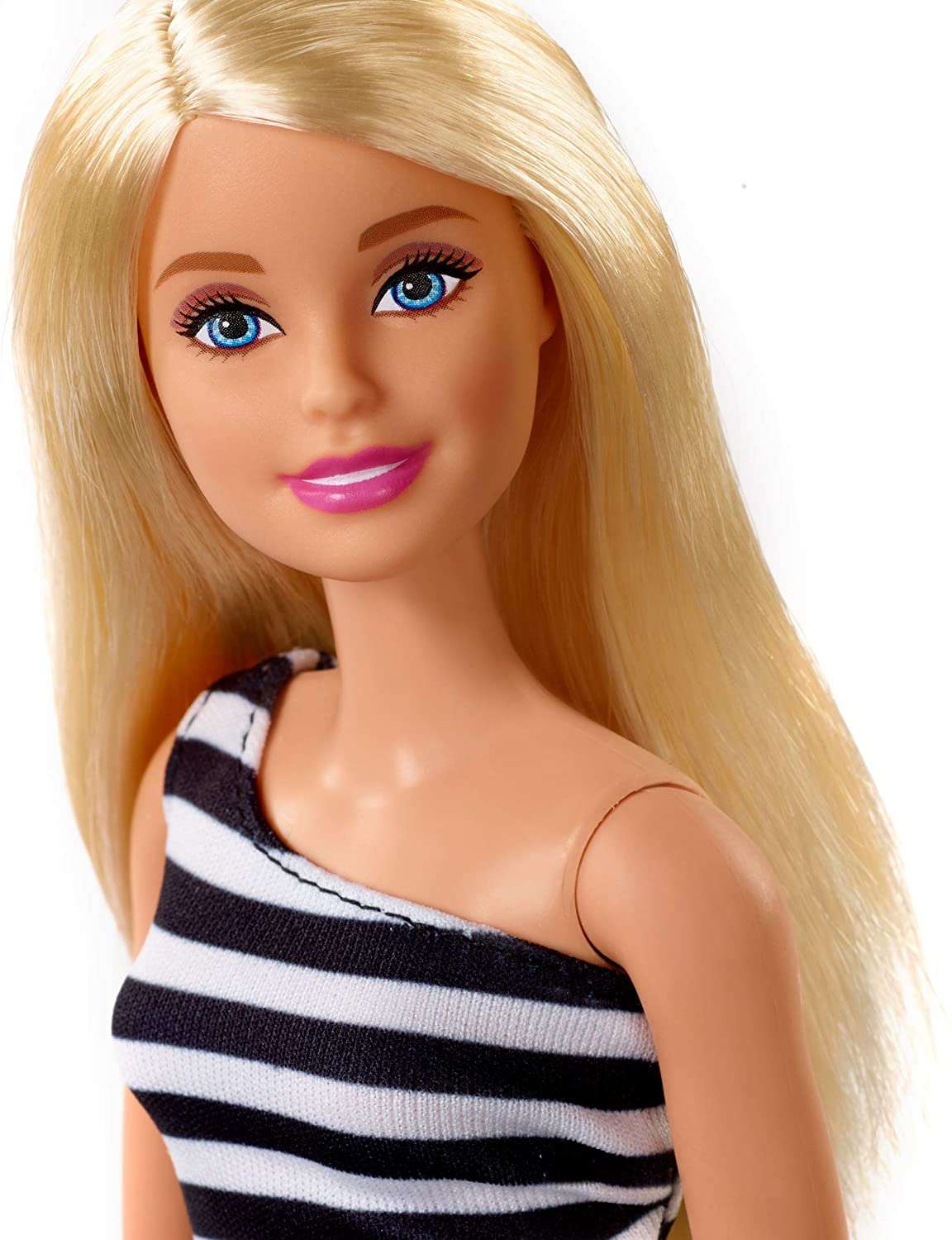 Każda lalka Barbie ma swój własny styl oraz wygląd. Nasza lalka ma piękne niebieskie oczy, długie blond włosy i jasną skórę. Ubrana jest w modną, czarno-białą sukienkę mini w pasy z falbaną z boku. Sukienka w nowoczesny sposób nawiązuje do kostiumu, w jaki ubrana była pierwsza lalka Barbie stworzona przez markę Mattel. Na nogach nosi srebrne sandałki na wysokim obcasie.