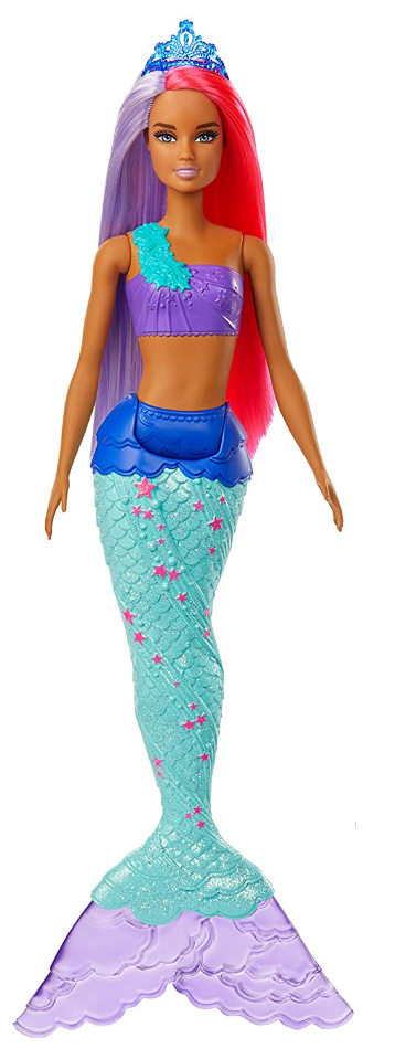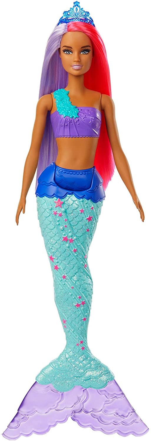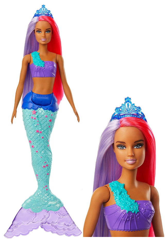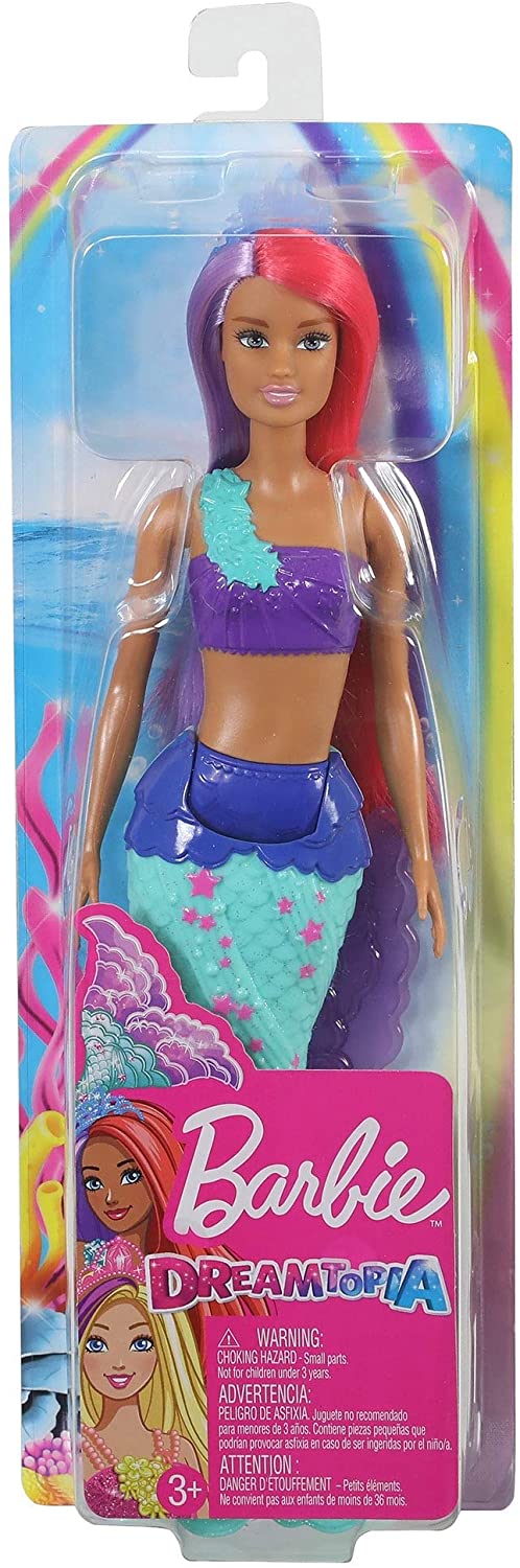 Syrenie lalki Barbie z serii Dreamtopia ze wspaniałymi lśniącymi ogonami przeniosą Cię wspaniałego świata magii i fantazji. Te przepiękne syrenki uwielbiają pluskać się w morzu. Każda syrenka ubrana jest w piękny kolorowy top. Ogonki lalek także są kolorowe i przepięknie ozdobione. Ogonki lalkę przystrojone są dodatkowo brokatem, co daje wspaniały efekt i dodaje jeszcze większego uroku. Każda z lalek ma piękne długie dwukolorowe włosy, a na głowie nosi tiarę - dzięki temu syrenie księżniczki wyglądają bajecznie. Syrenki dodatkowo wyginają się w talii, dzięki czemu dzieci mogą udawać, że „pływają” w morzu, lub sadzać je, by lśniły w słońcu, odbijając jego promienie. Końcówka ogonka jest doczepiana.