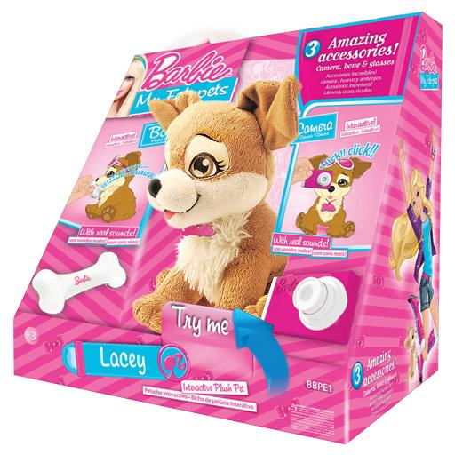 Taki piesek to marzenie każdej dziewczynki! Lacey to interaktywny pupil, który gdy tylko dasz mu kość zacznie warczeć i wydawać wesołe dźwięki jak prawdziwy. Po zbliżeniu do niego aparatu, usłyszymy dźwięk robionych zdjęć. Dźwięki u pieska możemy również uruchomić ukrytym przyciskiem na lewej łapce z logo Barbie. Dodatkowo puszysty i mięciutki Lacey ma swoje własne okulary przeciwsłoneczne.