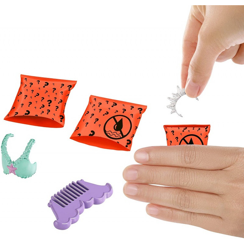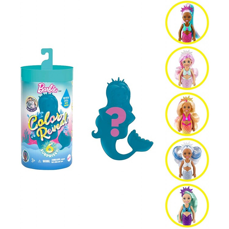 Color Reveal Chelsea to mnóstwo kolorowej zabawy! Odpakuj tubę, by wyjąć z niej wszystkie paczuszki, po czym napełnij ją wodą, by zanurzyć w niej laleczkę – to jedyny sposób, by przekonać się, jak Chelsea wygląda naprawdę! Teraz otwórz pozostałe pakunki i udekoruj nimi swoją lalkę, a zobaczysz, jak staje się prawdziwą pięknością. Do zebrania jest aż pięć fantastycznych wzorów Chelsea z syrenim ogonem – zawartość zestawu do samego końca pozostaje niespodzianką i dziewczynki dopiero po odpakowaniu tuby dowiadują się, która lalka trafiła do ich domowej kolekcji.