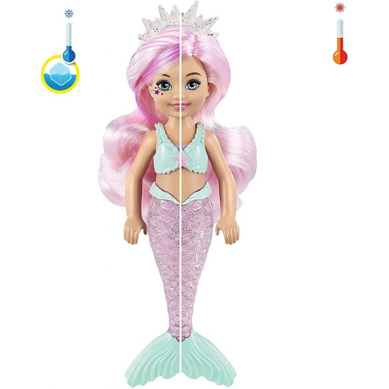 Zestaw Barbie Color Reveal Chelsea to kolejna odsłona odjazdowych zestawów Mattel z lalkami do kolekcjonowania. Tym razem dodatki mają przepiękną, metaliczną powłokę, która sprawia, że lalka-syrenka wygląda jeszcze piękniej! Co ciekawe, wygląd Chelsea zmienia się również pod wpływem różnicy temperatur, dzięki czemu w zimnej wodzie na jej twarzy pojawiają się dodatkowe ozdoby!