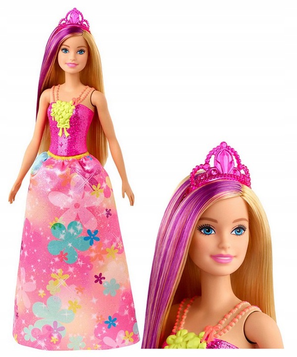 Śliczna Barbie o długich, blond włosach przeniesie Cię do krainy wyobraźni. Barbie jest ubrana w wyjątkową kreację - piękną balową tęczową suknię z mieniącym się gorsetem. Różowa tiara i dopasowane fioletowe buciki dopełniają jej fantastycznego wyglądu. Uroku dodają także fioletowe pasemka we włosach.