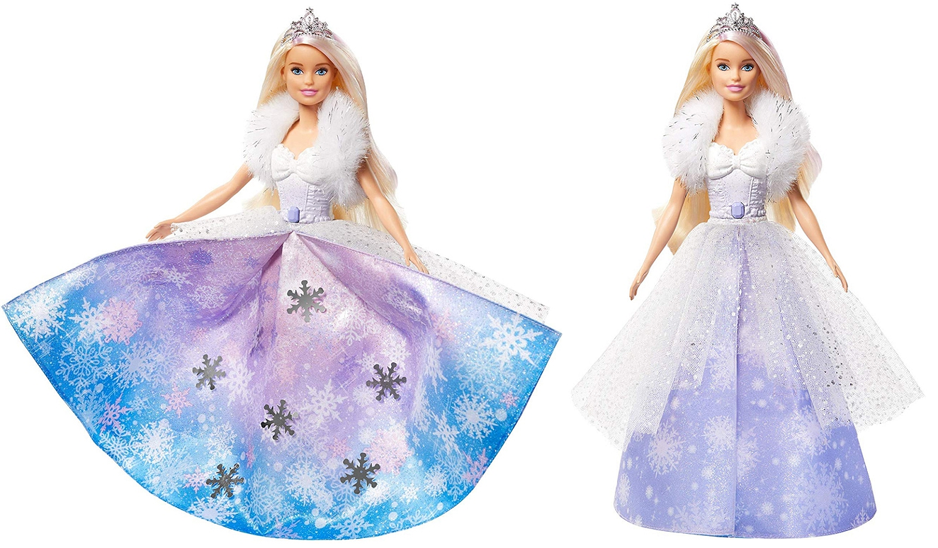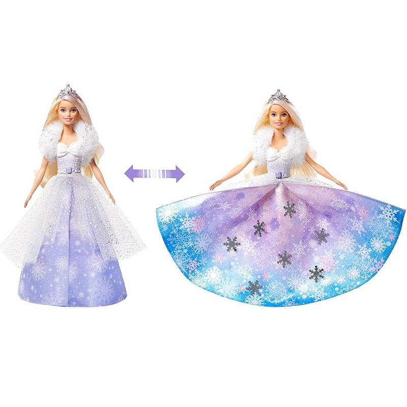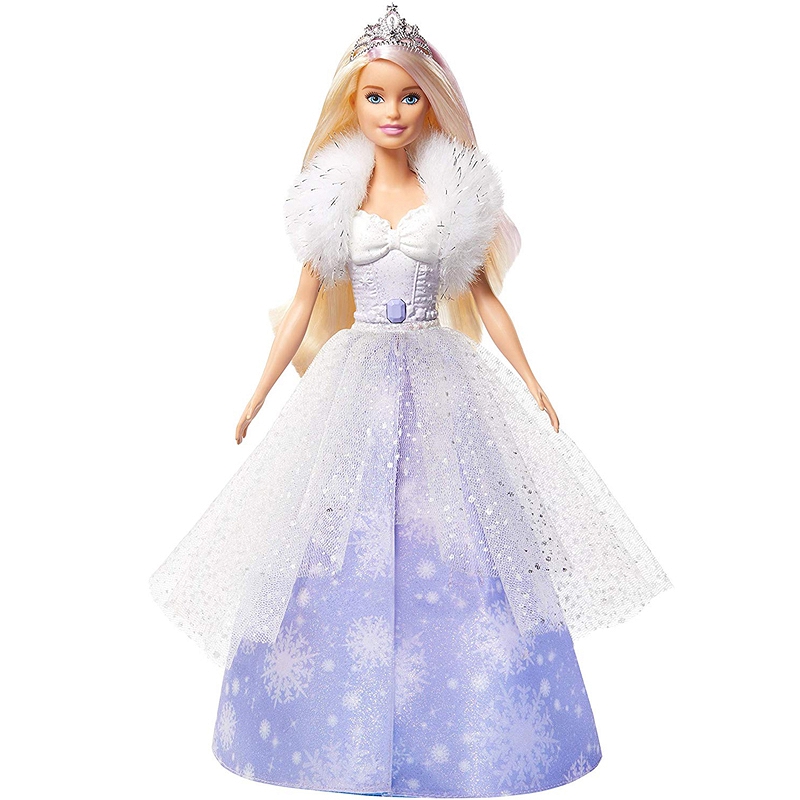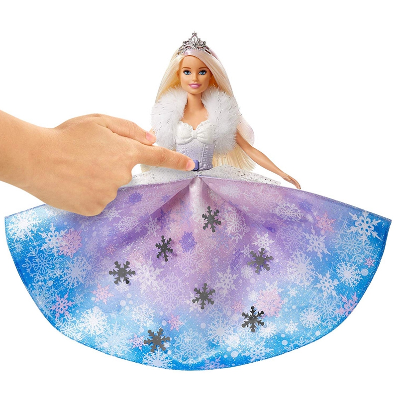 Śliczna Barbie o długich, blond włosach przeniesie Cię do krainy wyobraźni. Barbie jest ubrana w wyjątkową kreację – błyszczącą warstwową suknię w zimowych kolorach i z nadrukiem płatków śniegu. W tej kreacji lalka wygląda jak prawdziwa lodowa księżniczka. Błyszczący gorset z efektem zdobi mięciutkie bolerko ze sztucznego futerka. Naciśnij przycisk na gorsecie lalki, a jej sukienka „otworzy się”, odsłaniając srebrne płatki śniegu i piękne kolory – lawendowy, niebieski i różowy. Wśród jasnych włosów Barbie skrywa się różowy kosmyk, który dodaje fryzurze fantazji. Do zestawu dołączona jest szczotka i tiara.