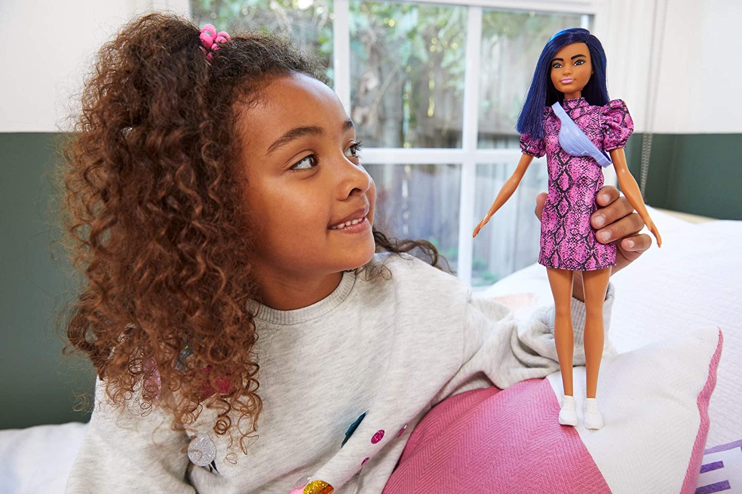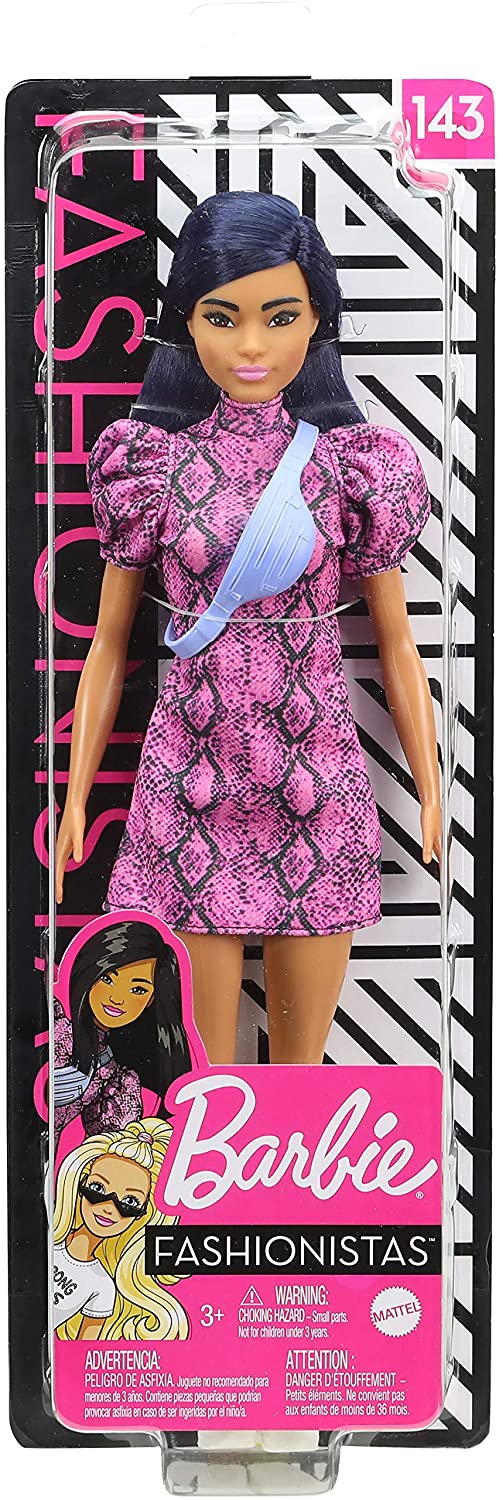 Lalka posiada ruchome ramiona i głowę i sięgające do ramion włosy w kolorze czarnym z granatowymi refleksami. Lalka ma mocny makijaż oczu, co kontrastuje z jej jasnoróżowymi ustami. Ubrana jest w różową sukienkę ze zwierzęcym wzorem, białe trampki oraz modną torebkę typu nerka. Lalka przedstawia nowoczesny, młodzieżowy styl. Modna lalka będzie doskonałą towarzyszką dla każdej dziewczynki, która lubi zabawkę lalkami, ale także stanie się doskonałym rozpoczęciem lub uzupełnieniem kolekcji lalek z serii Barbie Fashionistas.