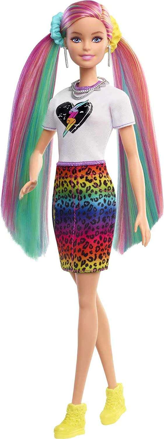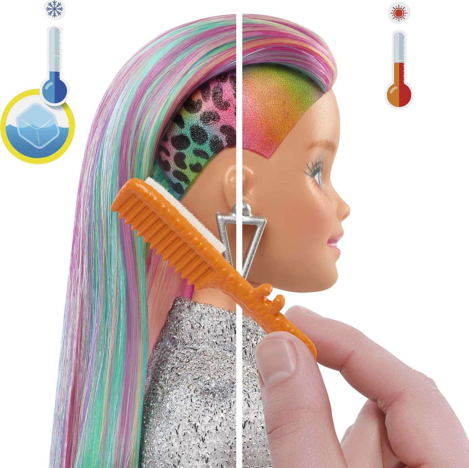 Zaszalej i wybierz się w kolorową przygodę wraz z punkową kolorową lalką Barbie. Lalka ubrana jest w szary golfik z bufiastymi rękawami, kolorową spódniczkę w panterkę oraz białe kozaczki. Całość szalonej stylizacji podkreślają długie kolorowe włosy. Zaczesz tęczowe włosy na bok, aby odsłonić wyjątkowe tęczowe ombre, przetrzyj bok głowy lalki zimną wodą, aby aktywować funkcję zmiany koloru i zobaczyć wspaniały wzór kolorowej panterki! W zestawie z lalką jest też 16 dodatków, w tym akcesoria do włosów i ubranka, które można dowolnie łączyć, aby tworzyć wyjątkowe stylizacje.