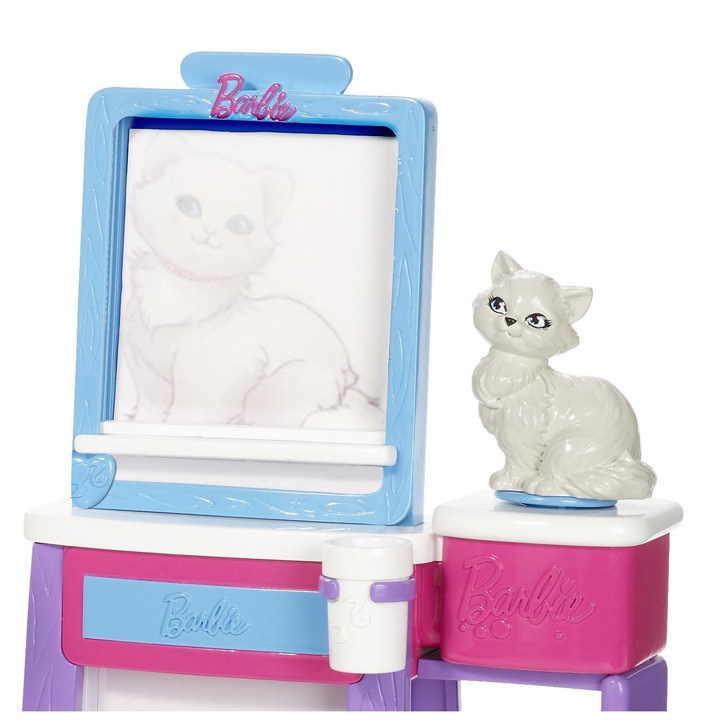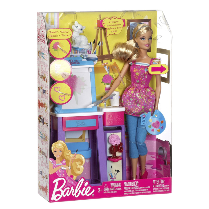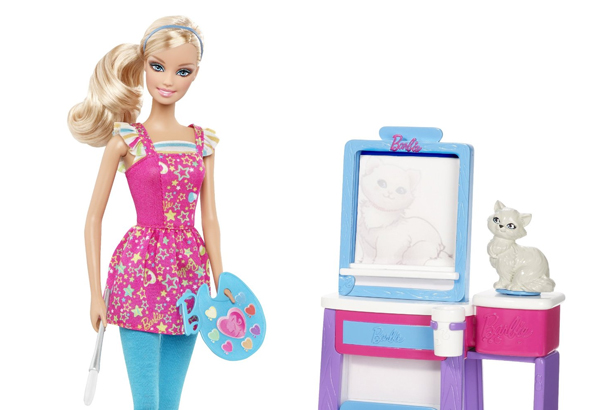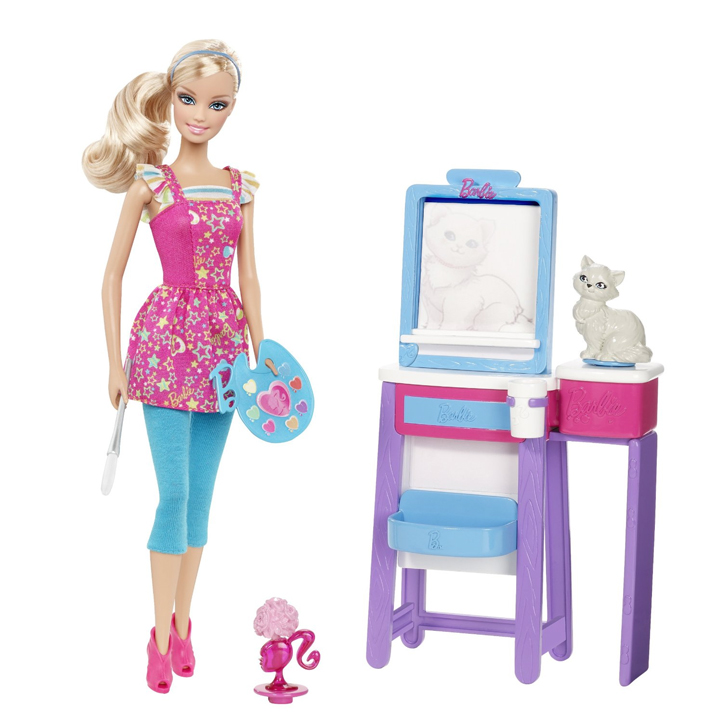 Wciel się w artystkę i namaluj piękny obraz kotki! Dzięki tej oryginalnej lalce dziewczynki mogą teraz wcielić się w rolę artystki malującej obrazy. Gdy wciśnie się dźwignię z tyłu lalki, Barbie porusza ręką z pędzlem i „tworzy obrazy”. Jest to możliwe dzięki funkcji zmiany koloru pod wpływem zimnej wody. Dziewczynki mogą same używać pędzla Barbie, malując na specjalnych sztalugach. Malując na „płótnie” na sztaludze, pod wpływem wody, powstaje obraz kotki lub wazonu.