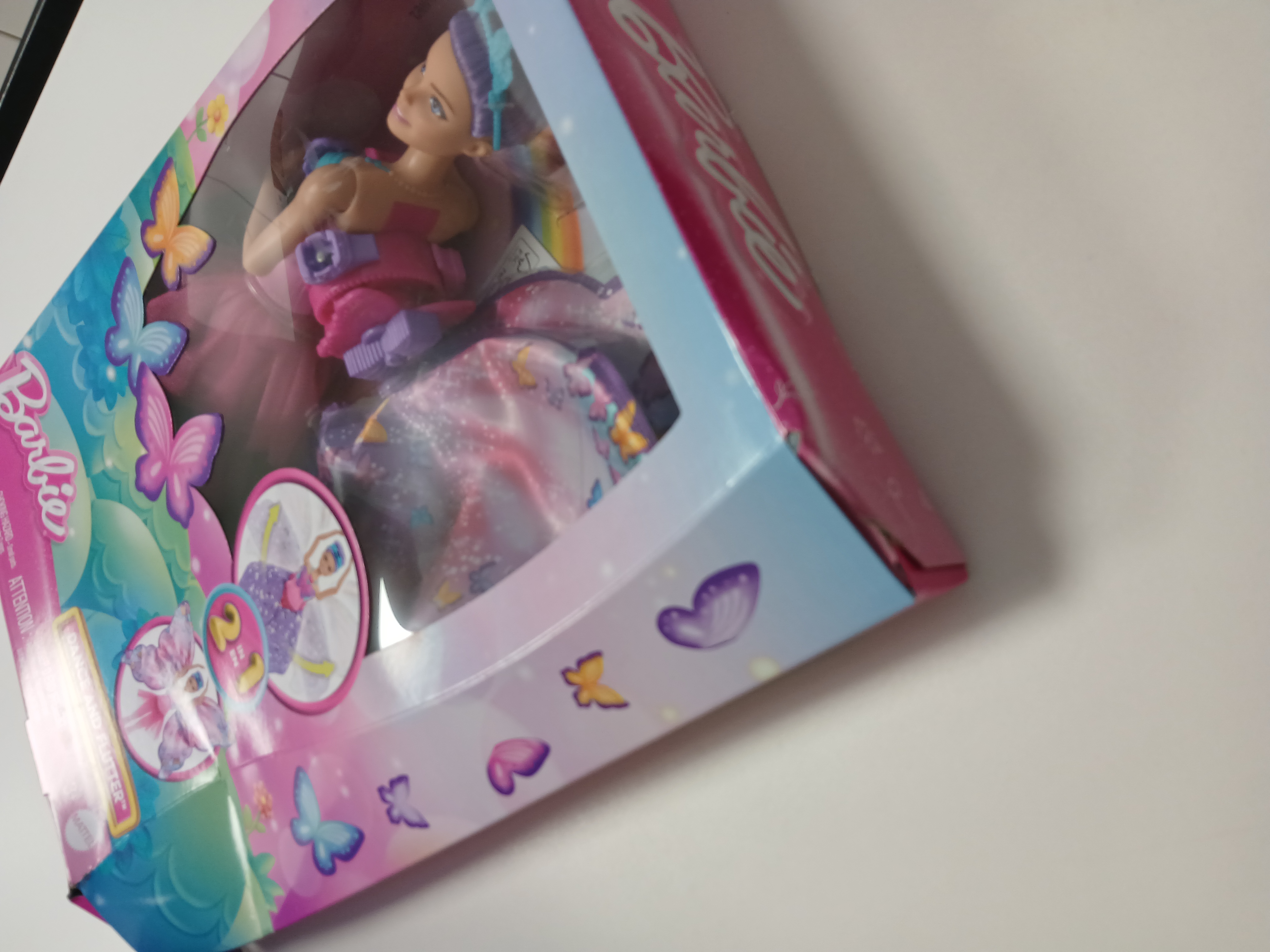 Lalka Barbie Motylkowa baletnica inspiruje do rozwinięcia skrzydeł wyobraźni z magiczną transformacją 2 w 1. Naciśnij naszyjnik lalki i podziwiaj, jak jej fioletowa spódniczka rozwija się niczym zaczarowana w rozłożyste skrzydła motyla. Ten niesamowity moment możesz powtarzać wciąż od nowa. Przepiękną stylizację uzupełniają fioletowy koczek z kwiecistą opaską do włosów, śliczny różowy gorset i spódniczka tutu.