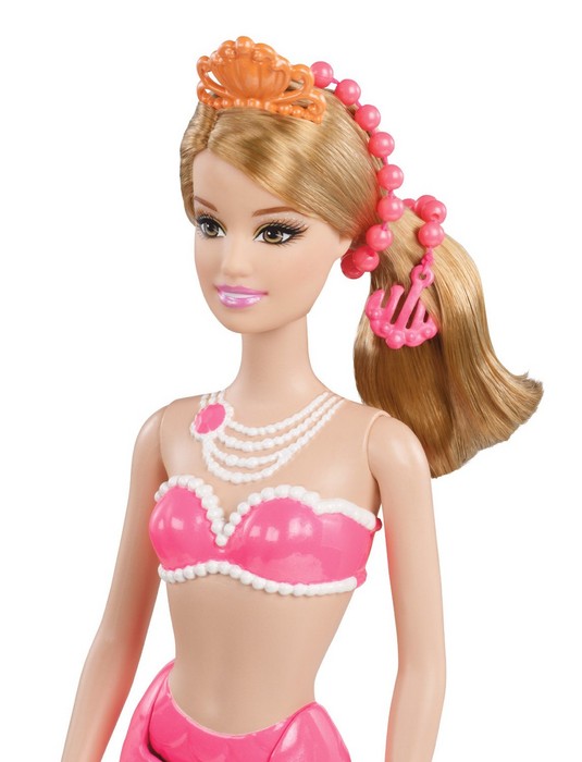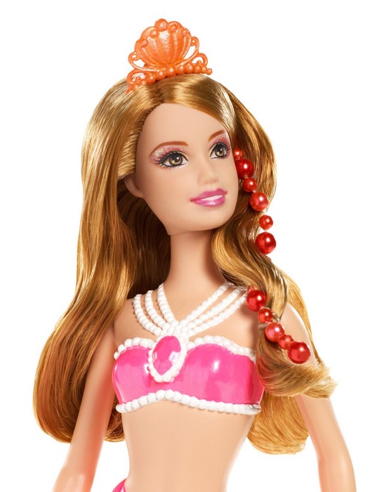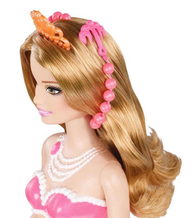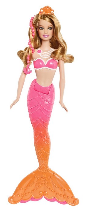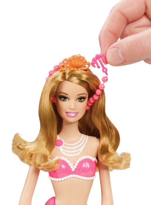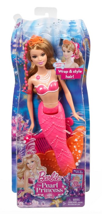 W nowym filmie „Barbie™ Perłowa Księżniczka” Barbie® występuje w roli pięknej syreniej księżniczki, która doskonali swe perłowe czary, pracując w Perłowym Salonie Piękności. Te trzy piękne syreny pracują razem z nią i zostają jej przyjaciółkami. Przeczesuj długie syrenie loki stylowym grzebieniem, doczep do nich kolorowe sznury pereł, twórz skomplikowane upięcia lub pozwól włosom swobodnie opadać! Syrenki zachwycają swoimi przepięknymi kolorowymi ogonami, ślicznymi perłowymi naszyjnikami i diademami. W ogonie każdej z syren ukryty jest grzebyk. W zestawie lalka i grzebyk.