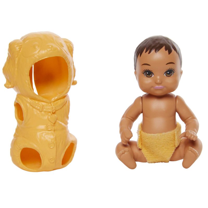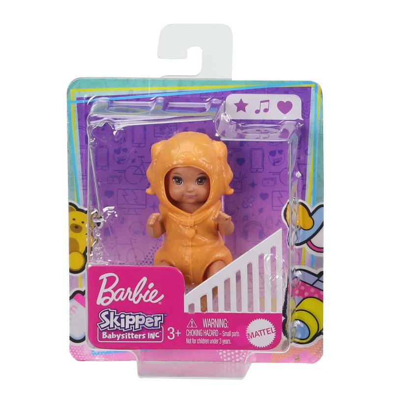 Wspaniałe akcesoria z linii Skipper™ Klub Opiekunek pozwolą dziewczynkom sprawdzić się w roli opiekunki do dziecka. Urocze małe zestawy są idealne do odegrania klasycznych scenek. Dziewczynki rozwiną swój zmysł opiekuńczości podczas zabawy w nianię, a dzięki tym lalkom bobaskom w uroczych zwierzęcych przebraniach zabawa jest jeszcze ciekawsza.! W zestawie znajduje się jedna lalka dziecko i specjalne akcesoria. Seria obejmuje lalkę dziecko w zdejmowanym kostiumie króliczka, pieska lub owieczki. Każda lalka ma też na sobie pieluszkę, którą można łatwo założyć i zdjąć podczas zabawy w przewijanie. Zbierz wszystkie lalki i zabawki Barbie Skipper z linii Klub Opiekunek, aby uatrakcyjnić zabawę oraz tworzyć własne historyjki.