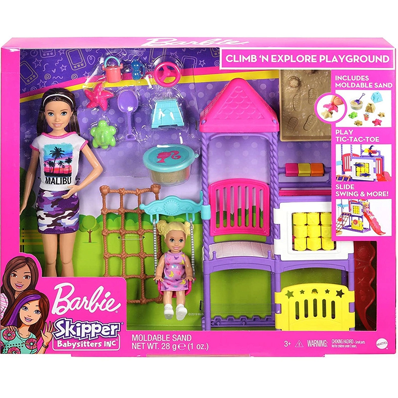 Zestawy lalki Skipper™ Klub Opiekunek™ pozwolą dziewczynkom sprawdzić się w roli opiekunki do dziecka. Razem ze Skipper™ lub jedną z jej przyjaciółek, lalką dzieckiem lub niemowlęciem odegrasz klasyczne scenki. Plac zabaw to spełnienie marzeń każdego dziecka: ma ruchomą huśtawkę, zjeżdżalnię, kręcącą się kierownicę i obrotowe klocki. Na placu zabaw znajduje się popularna gra w kółko i krzyżyk, w którą Barbie może zagrać ze swoją podopieczną. W zestawie jest piaskownica, pojemnik piasku do formowania, łopatka i 3 foremki, w tym zamek. Dzieci mogą razem z małą lalką budować babki z piasku. Mnóstwo pobudzających wyobraźnię elementów pozwoli młodym kandydatkom na nianie sprawdzić się w tej odpowiedzialnej roli. Dziewczynki pokochają odkrywać uroki opieki nad dziećmi. Zbierz wszystkie lalki z serii Klub Opiekunek™ i akcesoria dla nich, aby wypełnić im czas mnóstwem zabawy. Zestawy do zabawy z lalkami Opiekunkami Skipper™ zawierają lalkę opiekunkę w ubranku i z akcesoriami, lalkę dziecka lub niemowlęcia i tematycznie dobrane akcesoria.