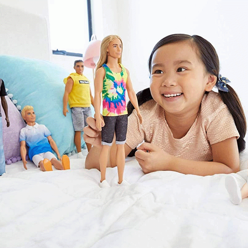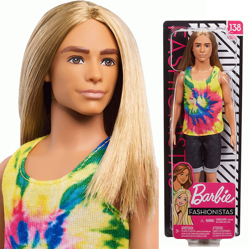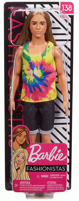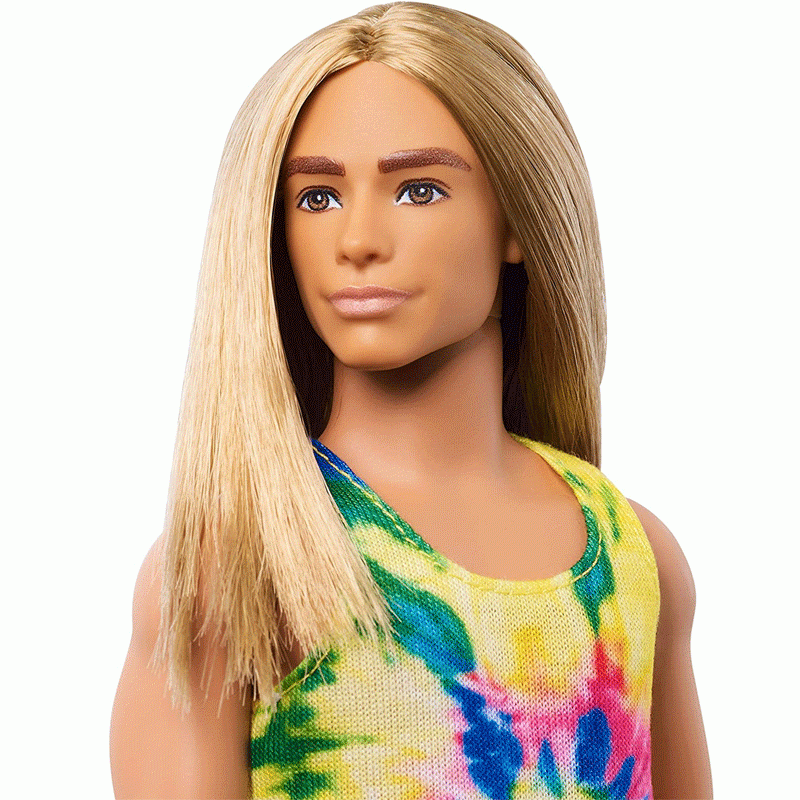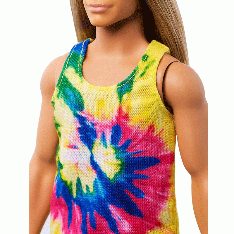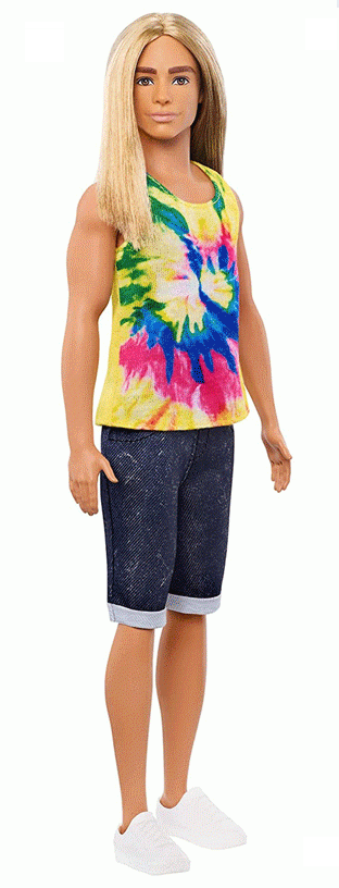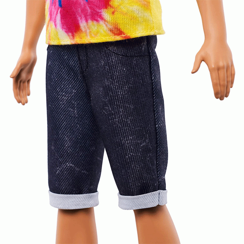 Modny Ken jest ikoną mody i luźnego, indywidualnego stylu. Nasz Ken to prawdziwy surfer. Ubrany jest w luźną swobodną kreację. Lalka ma na sobie koszulę bez rękawów, czarne krótkie spodnie oraz białe trampki. Oryginalnego wyglądu Kenowi dodają długie blond włosy.