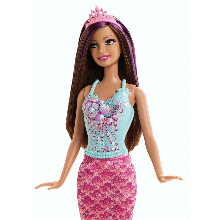 Odkryj magiczny świat Barbie razem z Syrenkami! Lalka ma na sobie gorsecik z błyszczącymi wykończeniami, na włosach kolorowe pasemka a na głowie tiarę. Jej kolorowy ogon można zdjąć, odtwarzając magiczną przemianę z syreny w dziewczynę i z powrotem. Dziewczynki mogą wymieniać ogony, płetwy i tiary pomiędzy różnymi syrenkami z tego asortymentu.