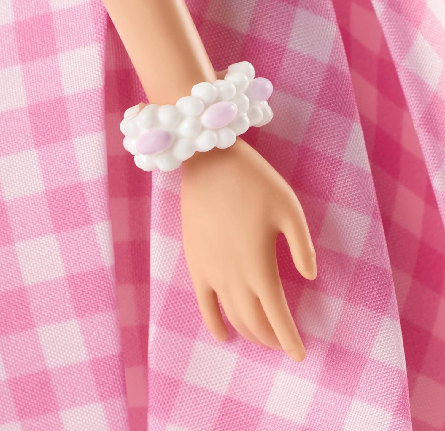 Witamy w świecie Barbie! Ta lalka Barbie prezentuje ponadczasowy styl w uroczej sukience wzorowanej na stylizacji z filmu „Barbie”. Ubrana w różową kraciastą sukienkę, stokrotkowy naszyjnik i pastelowe buciki na obcasie Barbie jest gotowa na każdą przygodę. Jest inspirowana wyglądem Margot Robbie jako Barbie, co sprawia, że będzie doskonałym prezentem dla fanów i kolekcjonerów. Lalka nie stoi samodzielnie.